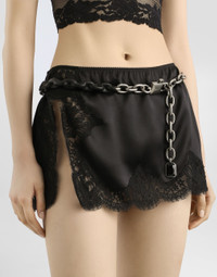 In the Fall/Winter 2025 Fashion Show Collection, shearling jackets, in fur-free versions, reveal slip dresses and create contrast' plays while denim welcomes fabric or Leo print inserts. Sweatshirts are the result of long experimentation with volumes. Evening looks become precious thanks to dresses with special embroideries and luminous touches of sequins and crystals. Sheepskin inserts also unite hats, shoes, and bags, including those with pockets. This short skirt is a real must-have for those who love the mix of elegance and modernity. Perfect for enhancing any outfit with a touch of class thanks to its sophisticated design and high quality materials. Short satin skirt: • Black • Slits on the right thigh • Invisible zip at the center back • The model is 175 cm tall and wears size 40 IT • Made in Italy External Composition: 80% Silk, 15% Cotton, 5% Polyamide