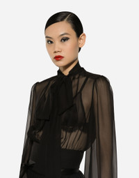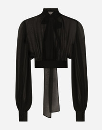 Menswear and womenswear mix and mingle, influencing one another and creating tailoring that embraces endless nuances, from the boldest to the most sophisticated, to define the rules of eternally classy femininity. A monochrome retelling in Nero Sicilia black, embellished by golden touches and rhinestones, adorning clean lines and incorporating stylish fabrics such as velvet, chiffon, lace, organza, and unique mesh details, the expression of authentic beauty for dresses, shirts and accessories. Short silk chiffon pussy-bow blouse: • Black • Round neck with scarf that can be tied into a bow • Long sleeves • Shirt-style cuffs • Unlined • Pussy-bow fastening on the front and buttons on the waist • The piece measures 45 cm from the center back on a size IT 40 • The model is 175 cm tall and wears a size IT 40 • Made in Italy External composition: 100% Silk