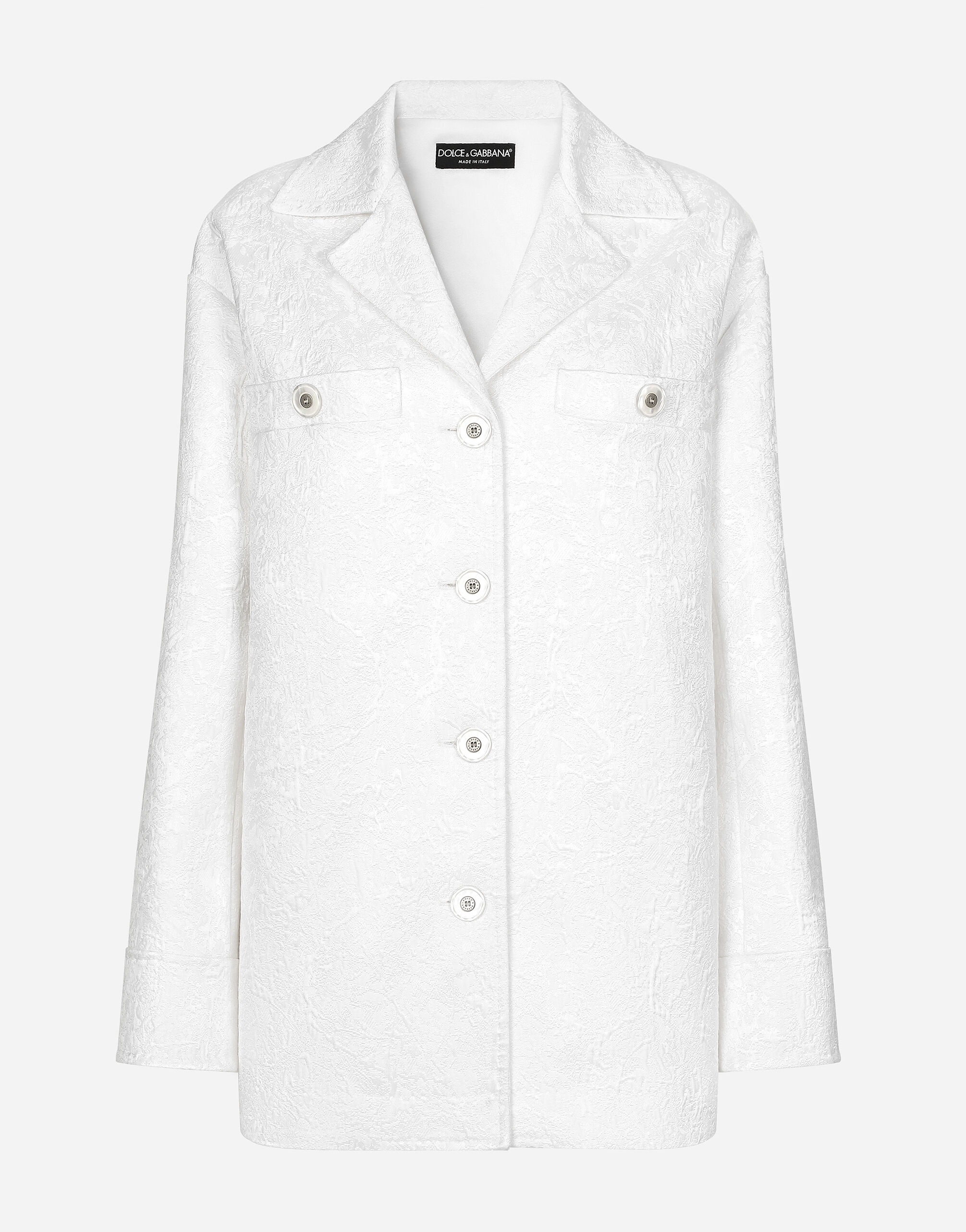 The Italian summers of the 1960s, the candid purity of white, the sophisticated elegance of the jet set of that era. The imagery of the FW24/25 Capri Collection encapsulates all this flawlessly. The pieces range from floaty poplin silhouettes or sack-style dresses and skirts, to brocade outerwear and floral-inlay fabric shirts. The iconic bags – the Logo Bag, the Sicily Bag and the Dolce Box – complement the looks, while the shoes come embroidered with designs inspired by the crystal-clear sea of Capri. Short single-breasted brocade coat: • White • Notched lapel collar • Long sleeves • Stretch silk satin lining • Mother-of-pearl-effect button fastenings • The piece measures 75 cm from the center back on a size IT 40 • The model is 175 cm tall and wears a size IT 40 • Made in Italy External composition: 64% Cotton 36% Viscose Internal composition: 92% Silk 08% Spandex