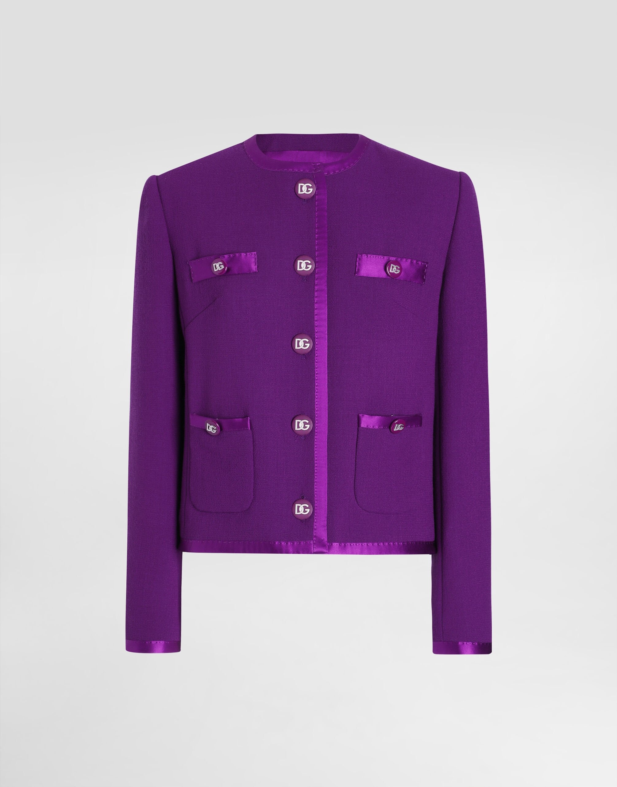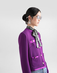 The Everyday Women's Collection reimagines contemporary daily wear with Dolce&Gabbana's signature style codes. Iconic fabrics mix with standout details like embroidered flowers, crystals, and jewel buttons, infusing elegance into every look. Gray animal print accented with green and purple, hyper-geometric jewelry, voluminous shapes and transparencies add unique touches. Men's tweed is reinvented with graphic twists, creating distinctive pieces that reflect refined sensuality. Short single-breasted wool crepe jacket: • Purple • Round neck • Long sleeves • Decorative DG-branded buttons on the patch pockets • Silk satin lining • DG-branded button fastenings • The piece measures 55 cm from the center back on a size IT 40 • The model is 175 cm tall and wears a size IT 40 • Made in Italy External composition: 90% Wool 08% Silk 02% Polyester Internal composition: 100% Silk