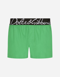 Pictorial, at times volumetric with a textured effect, the decorative “calligraphic-naturalistic” majolica in solid-color green gives life to a collection distinguished by eclectic silhouettes, some stolen from the world of sports, with a cool and light vibe. The vibrant two-tone accenting – green and white – is designed to enhance a series of details, such as the pockets, the green piping paired with the white silk pajamas, the stripes on the polo-shirts, the cuffs on the shirts or the jersey inserts on the T-shirts. Short light nylon swim trunks with Dolce&Gabbana logo: • Green • Stretch waistband with the all-over contrasting Dolce&Gabbana logo • Side pockets and a small zipped pocket on the back • Inner briefs in soft and comfortable fabric • Matching pouch in the same fabric as the garment with zipper • The item measures 32 cm on the outer leg and the hem is 34 cm wide on a size IT 4 • Made in Italy The difference in the print placement that you may find on this product is a feature of Dolce&Gabbana’s “Handmade” pieces. A detail that makes every garment or accessory unique and exclusive. External composition: 100% Polyester