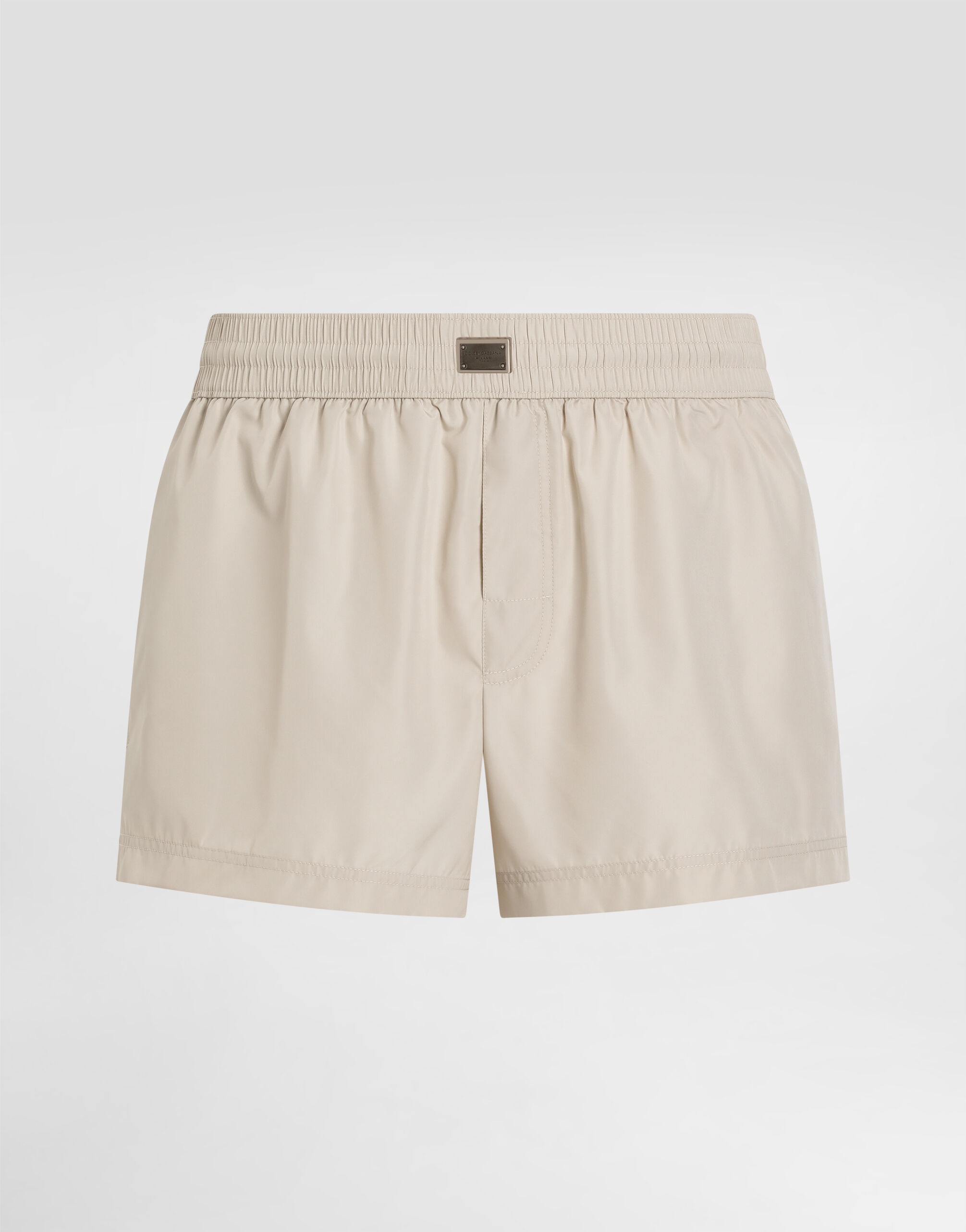 The DNA Men's Collection reimagines daily wear with bold contrasts, meticulous details, and innovative silhouettes. Outerwear stands out with clean lines and high-tech materials, merging sportiness with sophistication in sweaters, sweatshirts, and trousers. A striking color palette, including Black Sicily, caramel, cream, burgundy, and stone gray, pairs with iconic prints like Leopard and Polka dots, enhancing the collection's authentic and refined look. Short solid-color light nylon swim trunks with metal Dolce&Gabbana branded tag: • Beige • Stretch waistband and raised faux flap • Side pockets and a small zipped pocket on the back • Inner briefs in soft and comfortable fabric • Matching pouch in the same fabric as the garment with zipper • The item measures 31 cm on the outer leg on a size IT 4 • Made in Italy External composition: 88% Polyamide 12% Spandex Internal composition: 100% Polyester