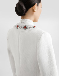 This tweed jacket represents a perfect combination of tradition and modernity, with refined details that enhance feminine elegance. Short tweed jacket with jewel embroidery: • White • Crew neck • Long sleeves • Fringe on the hem • Lined • The model is 175 cm tall and wears size 40 IT • Made in Italy External Composition: 67% Virgin Wool, 27% Viscose, 6% Polyamide Internal Composition: 92% Silk, 8% Elastane