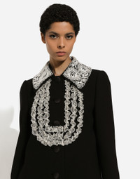 In the “WOMAN SS 24” Collection, the imagery of old Sicily interacts with the masculine, with sensual shapes, lace, nude tones and delicate overlays, to create pieces that move amid clean silhouettes, the elegance of the 1960s, the contrasts of black and white and luxurious textures. The designers are reworking their signature style and their iconic Sicilia black color to convey an aware, seductive and confident Sicilian WOMAN who is imbued with sensuality. Short stretch wool crepe coat with lace details: • Black • Macramé baby collar with lace embroidery • Long sleeves • Sack fit • Welt pockets • Stretch silk satin lining • Button fastenings • The piece measures 79 cm from the center back on a size IT 40 • The model is 175 cm tall and wears a size IT 40 • Made in Italy External composition: 79% Virgin Wool 08% Cotton 07% Viscose 03% Polyamide 02% Polyester 01% Spandex Internal composition: 92% Silk 08% Spandex