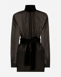 Menswear and womenswear mix and mingle, influencing one another and creating tailoring that embraces endless nuances, from the boldest to the most sophisticated, to define the rules of eternally classy femininity. A monochrome retelling in Nero Sicilia black, embellished by golden touches and rhinestones, adorning clean lines and incorporating stylish fabrics such as velvet, chiffon, lace, organza, and unique mesh details, the expression of authentic beauty for dresses, shirts and accessories. Short wool crepe and silk organza dress: • Black • High velvet neck • Long sleeves with wool cuffs • Belted waist • Unlined • Rear zipper and hook-and-bar fastening • The piece measures 40 cm from the waist down on a size IT 40 • The model is 175 cm tall and wears a size IT 40 • Made in Italy External composition: 53% Silk 28% Virgin Wool 17% Viscose 01% Spandex 01% Polyamide
