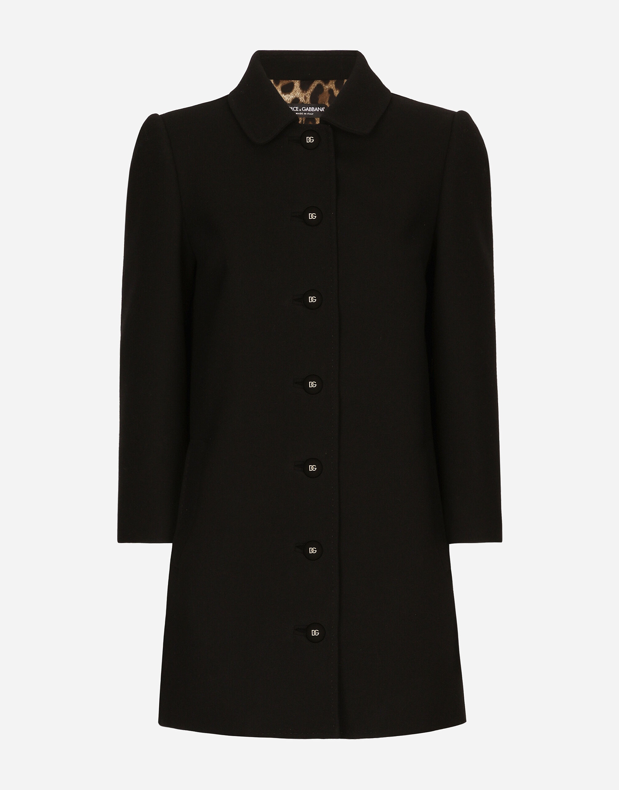 The DNA collection is distinguished by timeless shapes, bringing together three concepts: Sicilian flair, tailoring and sensuality. Nero Sicilia black and optical white predominate and pair with colors that catapult us onto the island of Sicily and make us dream. The designers channel the timeless wardrobe made up of creations that are instantly unmistakable in their simplicity, presenting us with sophisticated beauty loaded with meaning and symbolism that transcends fashion. Short stretch woolen coat: • Black • Baby collar • Long sleeves • Welt pockets • Leopard-print stretch satin lining • Canneté-covered button fastenings and DG logo • The piece measures 80 cm from the center back on a size IT 40 • The model is 175 cm tall and wears a size IT 40 • Made in Italy External composition: 98% Virgin Wool 2% Spandex Internal composition: 97% Polyester 3% Spandex
