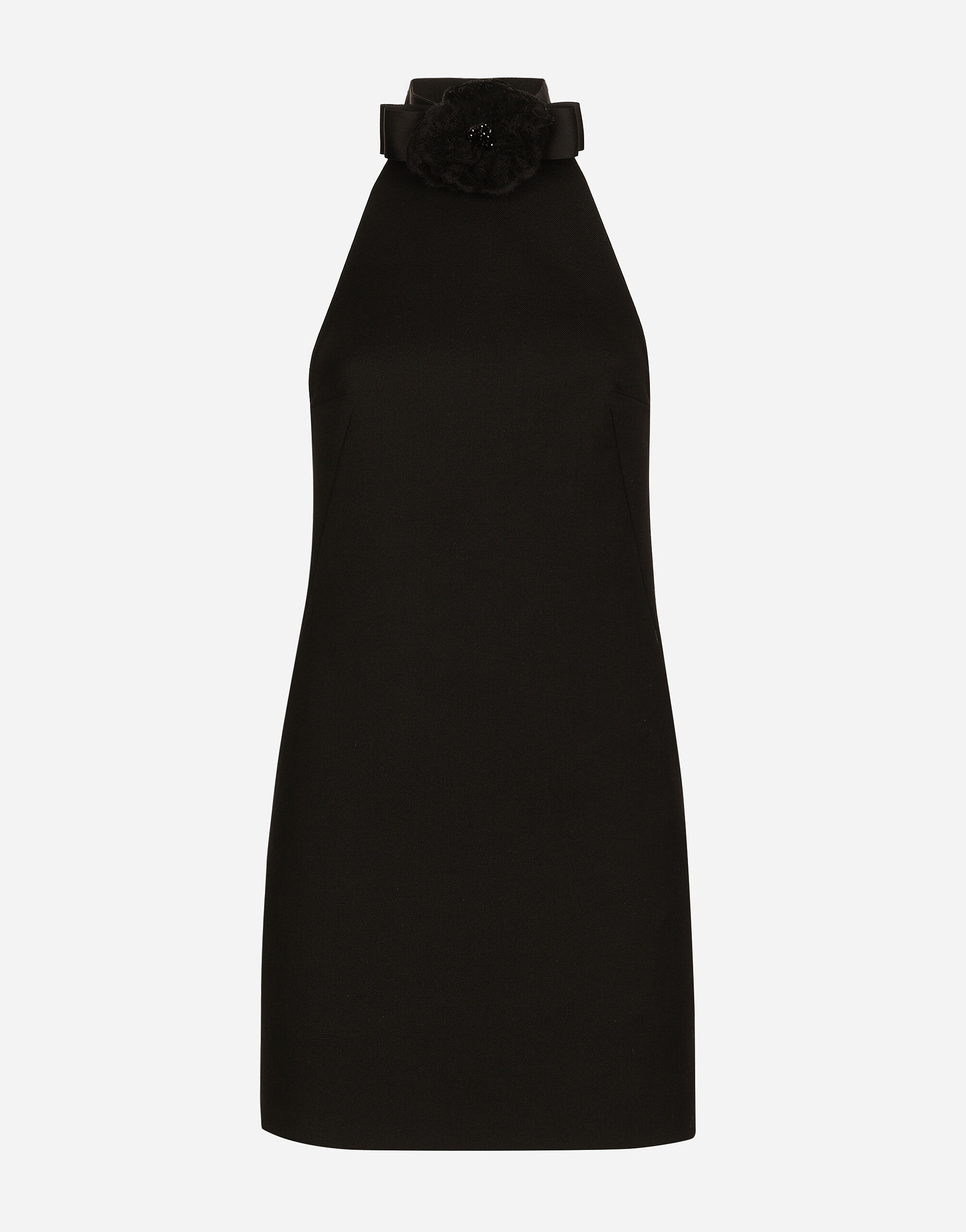 In the “WOMAN SS 24” Collection, the imagery of old Sicily interacts with the masculine, with sensual shapes, lace, nude tones and delicate overlays, to create pieces that move amid clean silhouettes, the elegance of the 1960s, the contrasts of black and white and luxurious textures. The designers are reworking their signature style and their iconic Sicilia black color to convey an aware, seductive and confident Sicilian WOMAN who is imbued with sensuality. Short woolen dress with rear neckline: • Black • Halterneck with flower appliqué • Sleeveless • Stretch silk satin lining • Rear zipper and hook-and-eye fastening with elastic • The piece measures 43 cm from the center back of the neck on a size IT 40 • The model is 175 cm tall and wears a size IT 40 • Made in Italy External composition: 100% Virgin Wool Internal composition: 92% Silk 08% Spandex
