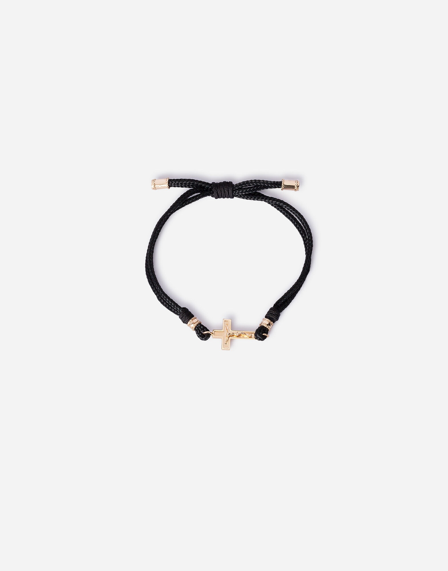 The bracelet consists of an adjustable fabric cord, hand-knotted, and a cross-shaped pendant on which shiny surfaces alternate with satin surfaces, and the figure of Christ is also present on the cross. On the back of the pendant, the logo "DOLCE&GABBANA" is engraved. The composition is enhanced by two spacers decorated with twisted wire and two ends in yellow gold on which the logo is displayed on the front. Technical features: Gold 750/000 Black waterproof cord adjustable up to a circumference of 25 cm. Made in Italy. Composition: Yellow Gold 750/000