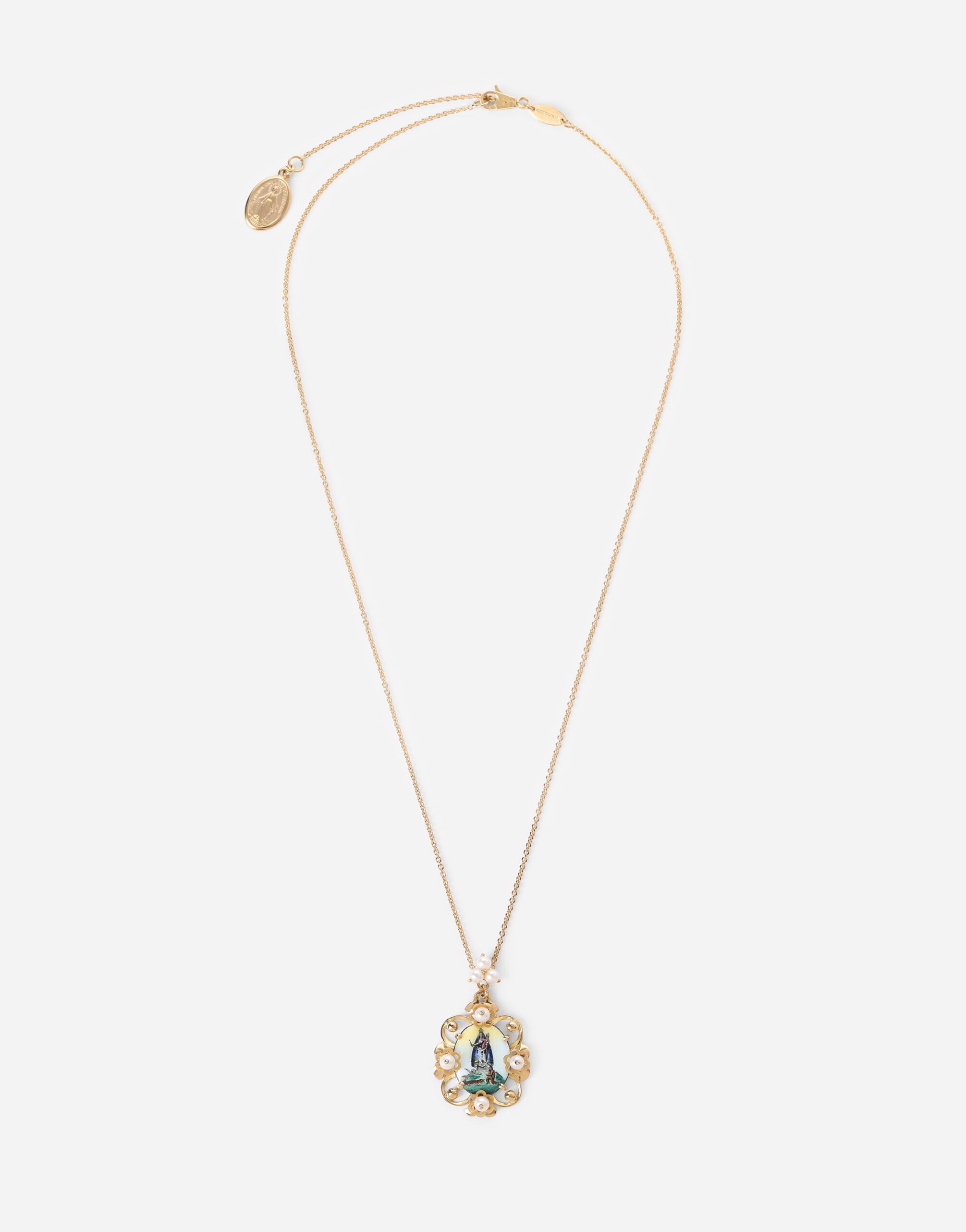 The necklace consists of a thin rolo chain and a hand-painted 19th-century ceramic miniature depicting different religious figures, connected to the main thread by a clover of spherical pearls. The precious pendant is enclosed in a gold frame enriched with four spherical pearls set on floral mounts. A medal depicting the Madonna with the DOLCE&GABBANA logo engraved on the back has been added as a terminal in the adjustment chain. Technical features: Gold 750/000 Length: 45 + 5 cm adjustable Gems: 7 round freshwater pearls Made in Italy. Composition: Yellow Gold 750/000