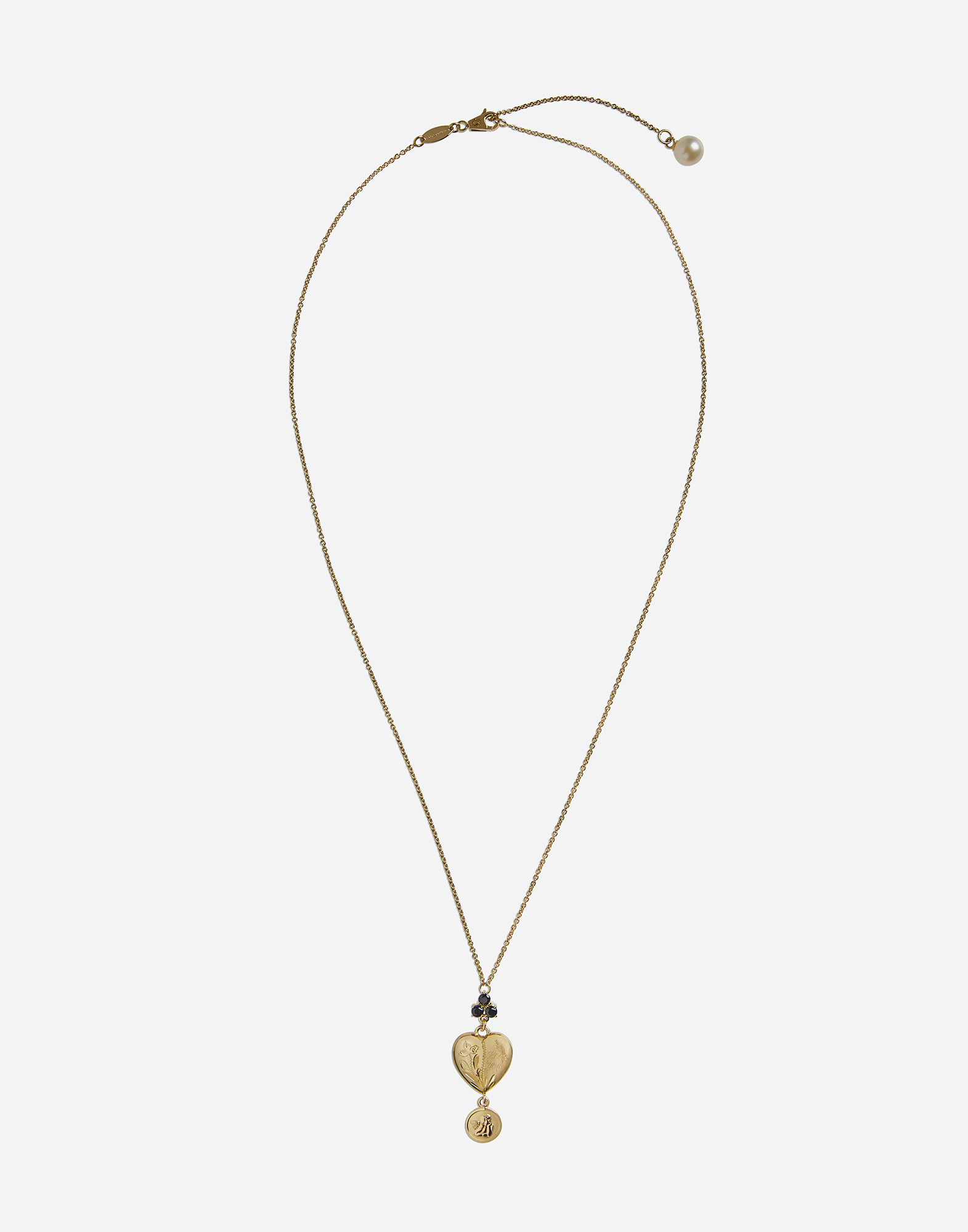 The necklace consists of a thin "rolo" chain and a heart-shaped pendant, connected to the main wire by a clover of round black sapphires. The pendant, which bears the logo DOLCE&GABBANA on the back, is embellished with the engraving of the words I love you and a small medal depicting a cherub angel. A spherical pearl has been inserted as a terminal in the adjustment chain. Gold 750/000 Length: 50 + 5 cm adjustable Gems: 3 round black sapphires 1 spherical freshwater pearl Made in Italy Add your personal touch to the product such as your initials or a personalized message by sending the request to CustomerServiceJewelleryWatches@dolcegabbana.it In case of personalization, the item cannot be returned. Composition: Yellow Gold 750/000