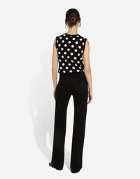 The FW24/25 Mambo Collection is rewriting the rules of Italian elegance, merging the sophisticated style of the 1940s and 1950s with the iconography of American pin-ups. The unmistakable polka-dot motif takes center stage, coming in a variety of shapes and sizes and adorning tulle, charmeuse, twill, silk and poplin, giving life to looks distinguished by black and white accessories and details. An homage to the beauty of Italy and its traditions, the distinctive details of Dolce&Gabbana’s creations. Silk and wool tank top with polka-dot inlay: • Black and White • 18-gauge knit • Round neck • Sleeveless • Regular fit • The piece measures 55 cm from the shoulder seam on a size IT 40 • The model is 175 cm tall and wears a size IT 40 • Made in Italy External composition: 58% Wool 42% Silk