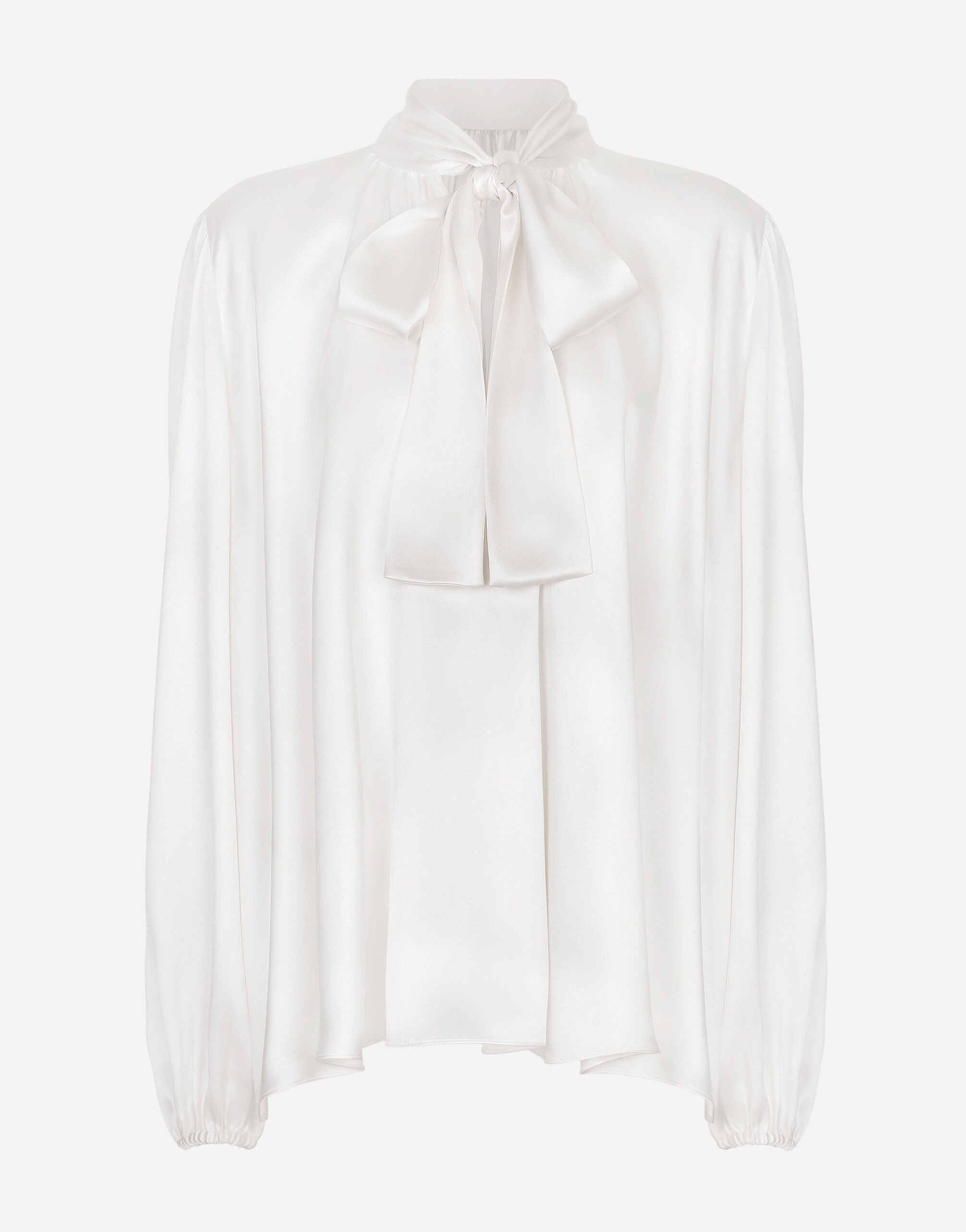 In the Black Sicily Collection, black, the absolute protagonist, becomes sensual black, sheer black, Dolce&Gabbana black. The key concept is “Black on Black”. Playing around with proportions, volumes, layered fabrics and sheer details, this style becomes absolute, bold and sexy. Unique and unmistakable, it is conveyed through the contrasts between glossy and matte fabrics, lines, volumes and special details, thereby expressing a woman’s various personalities and the true identity of Dolce&Gabbana. Silk satin blouse with pussy-bow: • White • Round neck with pussy-bow • Long sleeves with stretch cuffs • Plunging keyhole detail on the center front • Unlined • The piece measures 68 cm from the back of the neck on a size IT 40 • The model is 175 cm tall and wears a size IT 40 • Made in Italy The difference in the print placement that you may find on this product is a feature of Dolce&Gabbana’s “Handmade” pieces. A detail that makes every garment or accessory unique and exclusive. External composition: 100% Silk