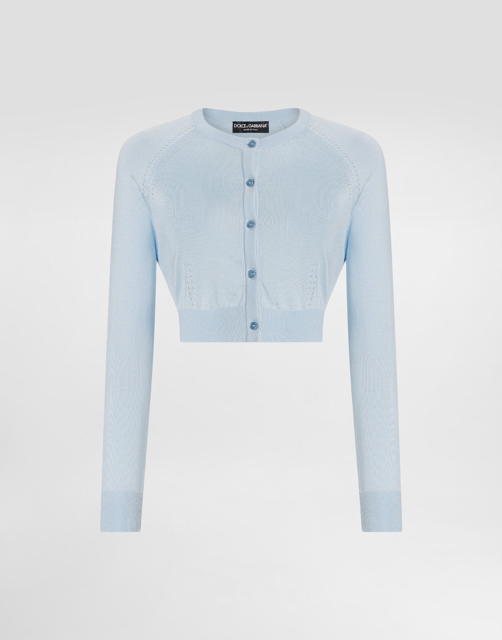This cardigan is the epitome of sophistication and versatility, perfect for completing any outfit with a touch of elegance. Made in a delicate light blue, its design with buttons and long raglan sleeves makes it suitable for both casual and formal occasions. Silk worked with punches gives a unique and sophisticated texture. Silk cardigan with punches: • Light blue • Crew neck • Long sleeves • Front buttons • Bottom width 36 cm on size 40 IT • The model is 175 cm tall and wears size 40 IT • Made in Italy External Composition: 97% Silk, 3% Polyamide