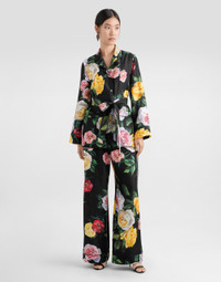 The Women's Black Sicily Collection reinforces Dolce&Gabbana's iconic fabrics and codes rooted in Italian heritage. Sensual silhouettes, highlighted by floral prints and refined corsetry, evoke an intriguing elegance, while the iconic black lace, satin, and velvet dominate the collection. Denim in various shades of blue introduces a contemporary twist, balancing the classic and modern. Embroidered crosses, medals, and jewelry add a sophisticated touch. Belted silk habotai pajama shirt with rose and peony print: • Multi-colored • Notched lapel collar • Long sleeves • Patch pockets • Regular fit • Button fastenings with branded bottom edge and silk twill belt • The piece measures 75 cm from the back of the neck on a size IT 40 • The model is 175 cm tall and wears a size IT 40 • Made in Italy The difference in the print placement that you may find on this product is a feature of Dolce&Gabbana’s “Handmade” pieces. A detail that makes every garment or accessory unique and exclusive. External composition: 100% Silk