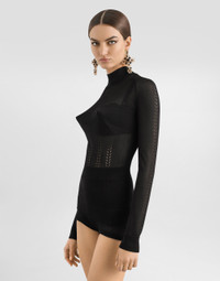 The Spring/Summer 2025 Women’s Collection is celebrating Italian beauty through bold and charismatic femininity. The 50s-inspired lingerie is the star, intermingling with fitted dresses, corsets and oversize trench coats. The iconic jackets have been updated with cropped cuts and modern inserts, while the floral prints add a romantic edge. The eveningwear shines with light fabrics and crystals, accompanied by look-defining accessories, from iconic bags to the cross earrings. Silk mock-turtleneck sweater with stitch work: • Black • 14-gauge knit • Turtle-neck • Long sleeves • Ribbed trim • Raglan cuts • Slim fit • The piece measures 60 cm from the shoulder seam on a size IT 40 • The model is 175 cm tall and wears a size IT 40 • Made in Italy External composition: 97% Silk 2% Polyamide 1% Spandex