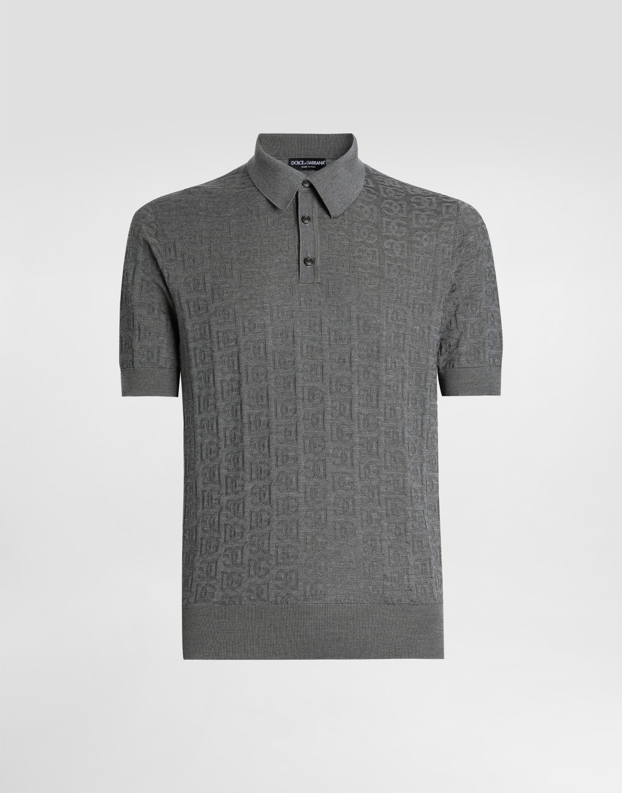 The DNA Men's Collection reimagines daily wear with bold contrasts, meticulous details, and innovative silhouettes. Outerwear stands out with clean lines and high-tech materials, merging sportiness with sophistication in sweaters, sweatshirts, and trousers. A striking color palette, including Black Sicily, caramel, cream, burgundy, and stone gray, pairs with iconic prints like Leopard and Polka dots, enhancing the collection's authentic and refined look. Plain-knit silk polo-shirt with all-over DG logo embroidery: • Gray • Regular fit • Button fastenings • Short sleeves • Fine-rib neck, sleeve trims and hem • 18-gauge knit • The piece measures 68 cm from the shoulder seam on a size IT 48 • Made in Italy External composition: 100% Silk