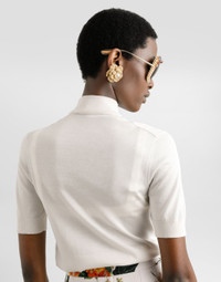 This elegant pullover is perfect for those looking for a versatile and refined garment. Made of silk with a refined flower-shaped brooch, it represents the perfect balance between style and comfort, ideal for enriching any wardrobe with a touch of class. Silk pullover with flower brooch: • White • Turtleneck • Long sleeves • Bottom width 60 cm on size 40 IT • The model is 175 cm tall and wears size 40 IT • Made in Italy External Composition: 100% Silk