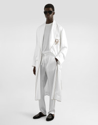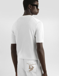 The Italian Holiday Men's Collection revisits 1950s style with a blend of relaxed fits and modern flair. Classic white shirts and tailored suits in refined fabrics contrast with casual denim and playful T-shirts featuring retro graphics with a futuristic twist. Bold prints—chessboards, cats, elegant lighters, and Mediterranean blue ribbons—alongside logo jacquard inspired by ties, infuse a contemporary edge into the essence of Italian holidays. Silk V-neck sweater with DG embroidery: • White • Regular fit • Short sleeves • Fine-rib sleeve trims and neck • 18-gauge plain knit • The piece measures 69 cm from the shoulder seam on a size IT 48 • Made in Italy External composition: 100% Silk