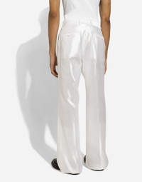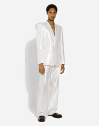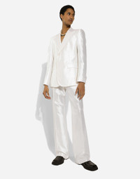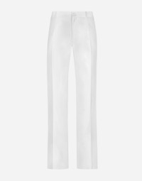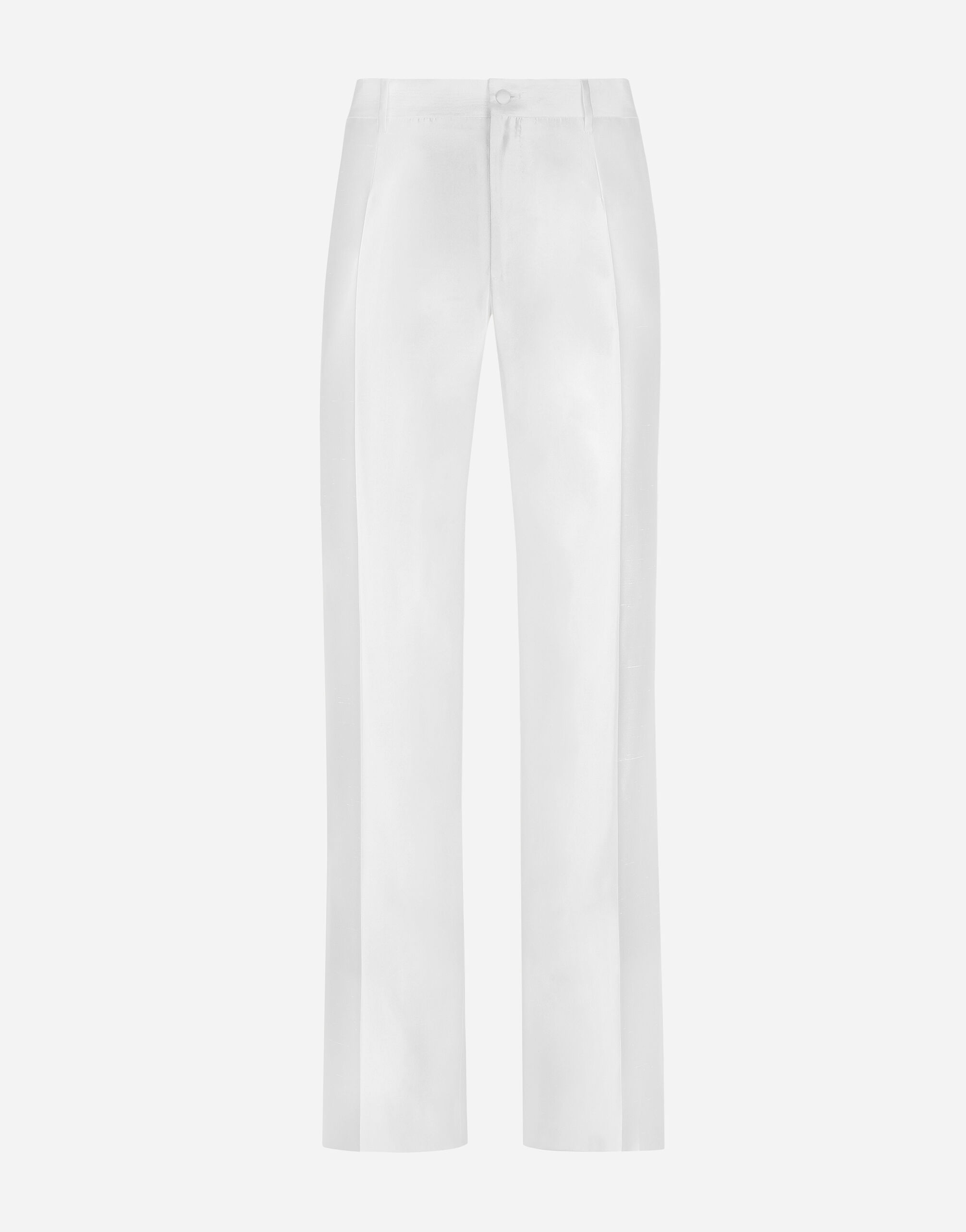 The Marina line has us dreaming of the Mediterranean sea and its myriad shades of blue, while also bringing weathered sailors to mind, yet with a contemporary edge. Aesthetic influences and clear lines, stormy sea Blue jackets, multi-pocket pieces, waterproof garments, anchor prints and materials that invite us to discover the “lighthouse keeper”. Fascinating, enigmatic and at times lonely, it tells the tale of a new masculine sensuality built with small yet precise proportions and attention to stylish detail. Tailored straight-leg pants in silk shantung: • White • Regular fit • Belt loops on the waist • Fly-covered zipper and button fastening • Front slant pockets and buttoned welt pockets at the back • The item measures 120 cm on the outer leg and the hem is 28 cm wide on a size IT 48 • Made in Italy External composition: 100% Silk