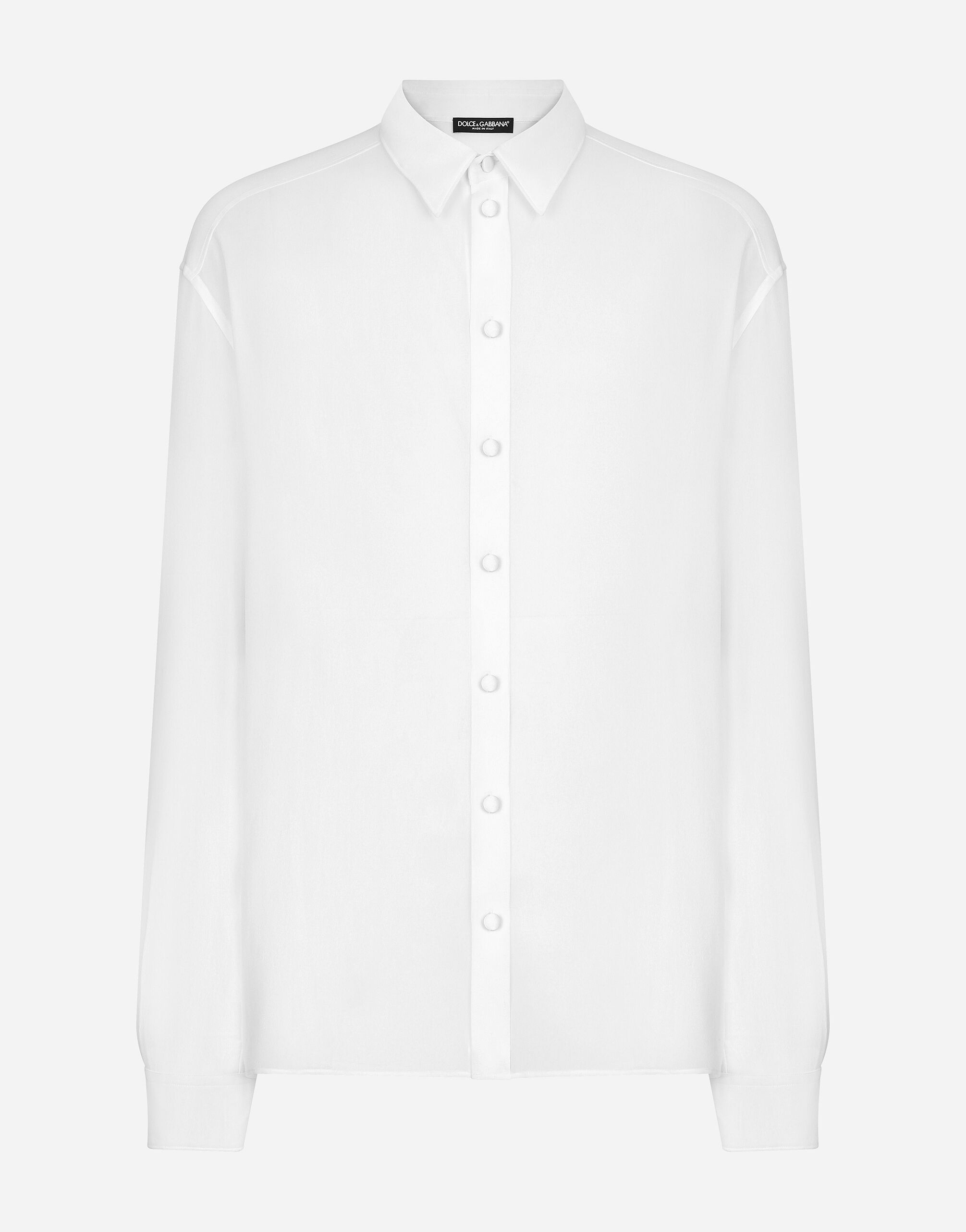 Contemporary men’s formalwear: The FW 24/25 Dolce&Gabbana Men’s Collection is embracing the concept of absolute elegance dominated by the iconic Nero Sicilia black. The daywear of the Dolce&Gabbana man comes to life through the outerwear that comes in a range of lengths and the slim-fit pants. For nightwear, the look becomes scintillating thanks to sequined embellishment and stone appliques. This refined taste can also be seen on the accessories, such as on the slip-ons with hand-applied organza flower accent and the new clutch. Silk georgette shirt: • White • Oversize fit • Kent collar • Long sleeves • Button fastenings • Rear yoke with inverted pleat on hem • The shirt measures 80 cm from the back collar seam on a size IT 40 • Made in Italy External composition: 100% Silk