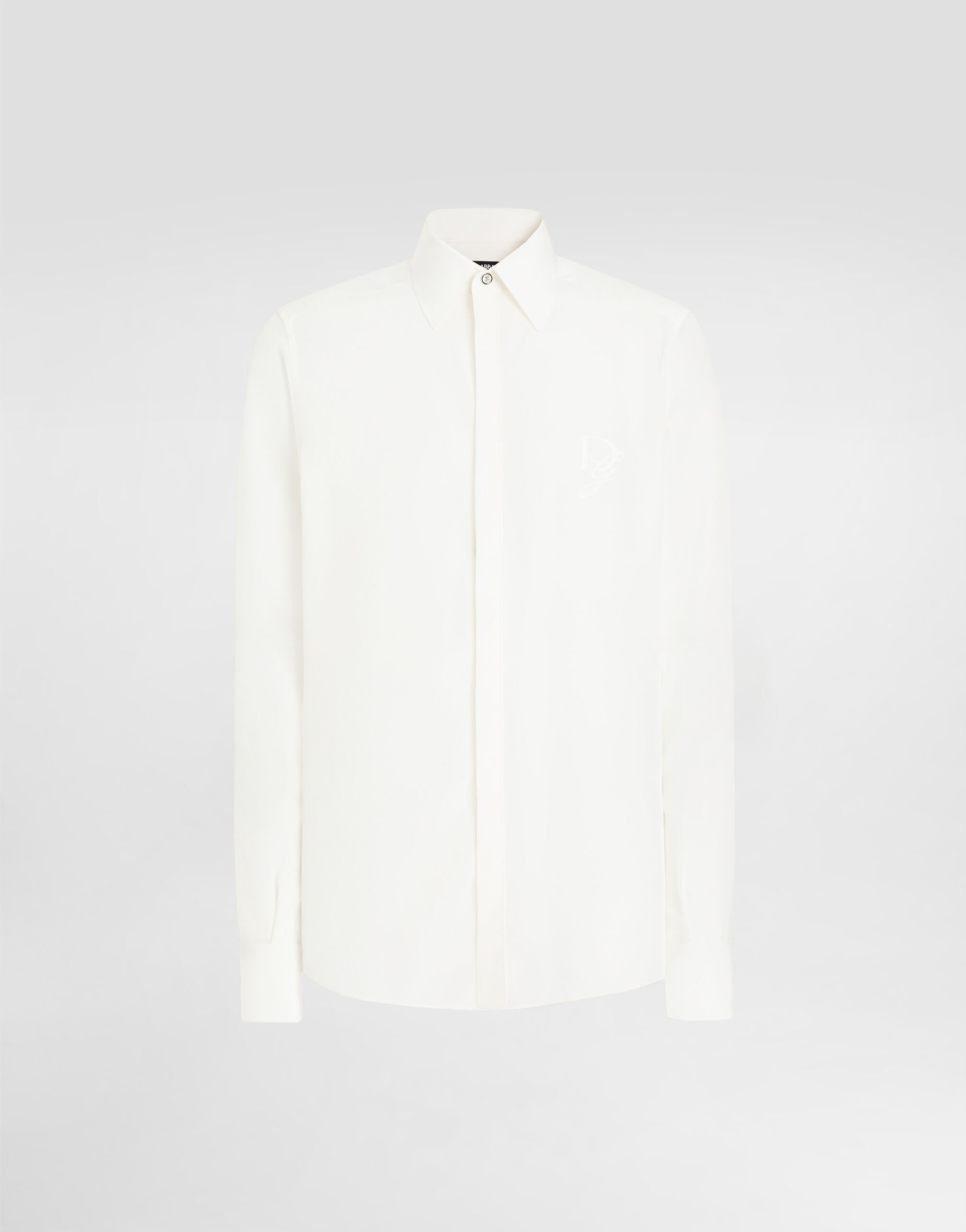 The Italian Holiday Men's Collection revisits 1950s style with a blend of relaxed fits and modern flair. Classic white shirts and tailored suits in refined fabrics contrast with casual denim and playful T-shirts featuring retro graphics with a futuristic twist. Bold prints—chessboards, cats, elegant lighters, and Mediterranean blue ribbons—alongside logo jacquard inspired by ties, infuse a contemporary edge into the essence of Italian holidays. Silk crepe de chine shirt with tonal DG logo embroidery: • White • Regular Martini fit • Italian collar • Button fastenings • Long sleeves • The piece measures 80 cm from the rear collar seam on a size IT 40 • Made in Italy External composition: 100% Silk