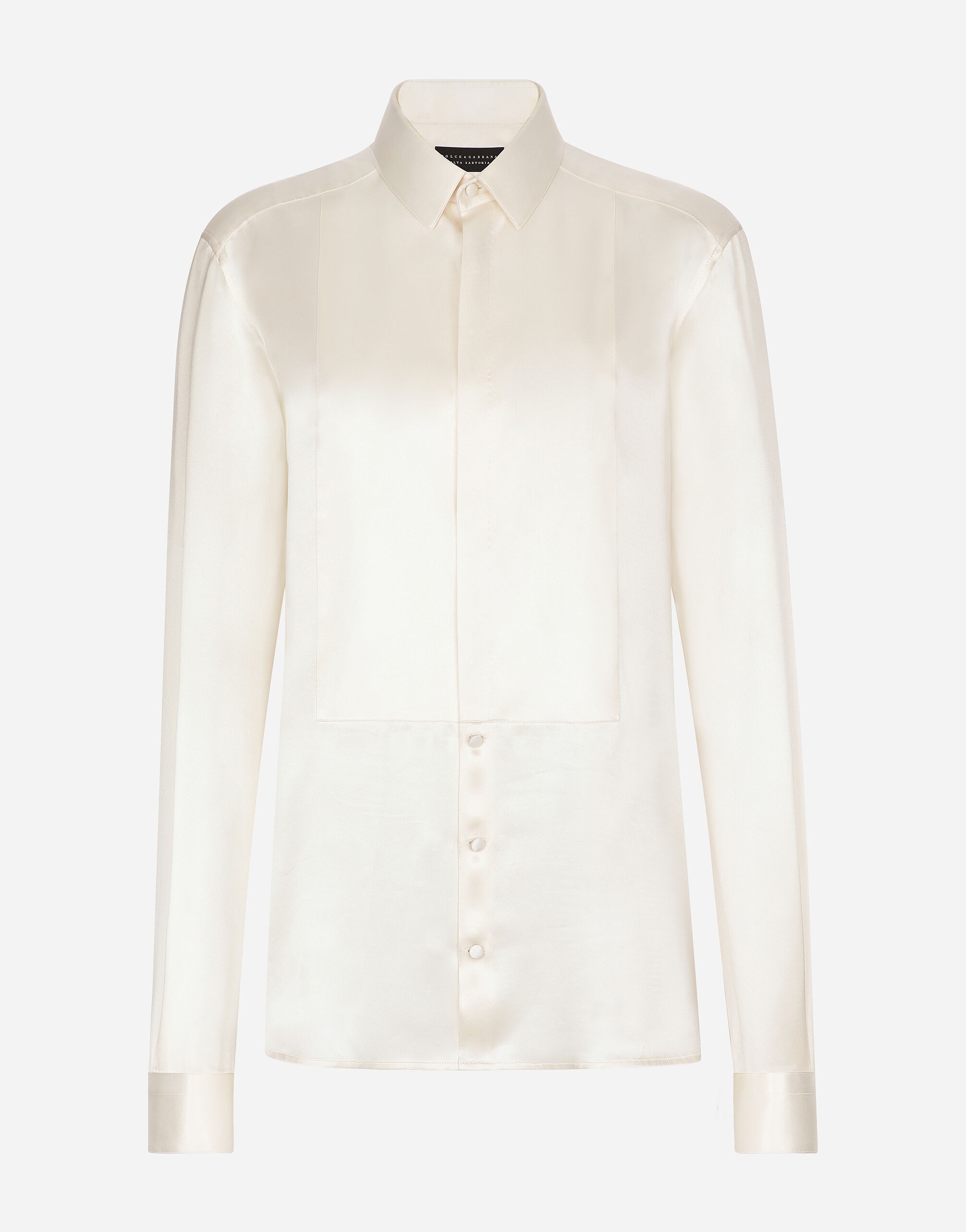 In the Black Sicily Collection, black, the absolute protagonist, becomes sensual black, sheer black, Dolce&Gabbana black. The key concept is “Black on Black”. Playing around with proportions, volumes, layered fabrics and sheer details, this style becomes absolute, bold and sexy. Unique and unmistakable, it is conveyed through the contrasts between glossy and matte fabrics, lines, volumes and special details, thereby expressing a woman’s various personalities and the true identity of Dolce&Gabbana. Silk shirt with shirt front: • White • Shirt collar • Long sleeves • Masculine fit • Button fastenings • The piece measures 75 cm from the center back on a size IT 40 • The model is tall • Made in Italy External composition: 100% Silk