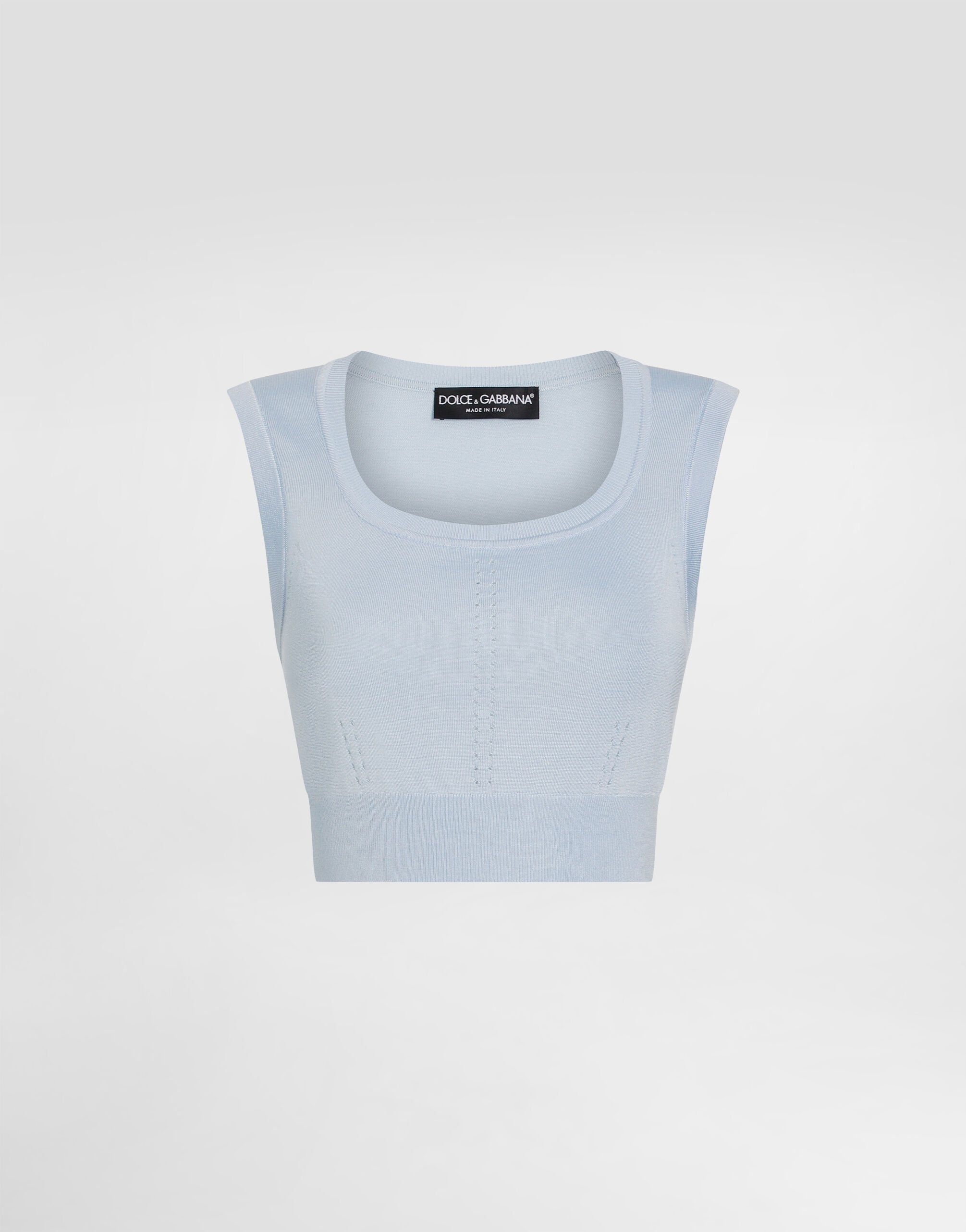 This sleeveless tank top is a summer wardrobe essential, combining elegance and comfort with its refined design and premium fabric. Silk tank top with punches: • Light blue • Crew neck • Sleeveless • The model is 175 cm tall and wears size 40 IT • Made in Italy External Composition: 97% Silk, 3% Polyamide