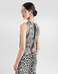 The Everyday Women's Collection reimagines contemporary daily wear with Dolce&Gabbana's signature style codes. Iconic fabrics mix with standout details like embroidered flowers, crystals, and jewel buttons, infusing elegance into every look. Gray animal print accented with green and purple, hyper-geometric jewelry, voluminous shapes and transparencies add unique touches. Men's tweed is reinvented with graphic twists, creating distinctive pieces that reflect refined sensuality. Silk tank top with fur print: • Animal Print • 18-gauge knit • Round neck • Sleeveless • Ribbed neck and hem • Regular fit • The piece measures 55 cm from the shoulder seam on a size IT 40 • The model is 175 cm tall and wears a size IT 40 • Made in Italy External composition: 100% Silk
