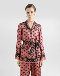The Women’s DNA Collection is introducing a new side to femininity, which comes in shades of rose quartz, poised between sheerness and opacity, lightness and structure, formality and sensuality. Geometric Dolce Jackets, jacquard pajamas and floral brocade dresses intertwine with ultra-romantic designs. The DG print becomes an iconic statement, while Cordonetto lace and hints of Sicily Black embody the essence of a determined yet romantic femininity. Silk twill pajama shirt with all-over DG logo scarf print: • Pink • Notched lapel collar • Long sleeves • Patch pockets • Regular fit • Button fastenings with branded bottom edge and silk belt • The piece measures 75 cm from the back of the neck on a size IT 40 • The model is 175 cm tall and wears a size IT 40 • Made in Italy External composition: 100% Silk