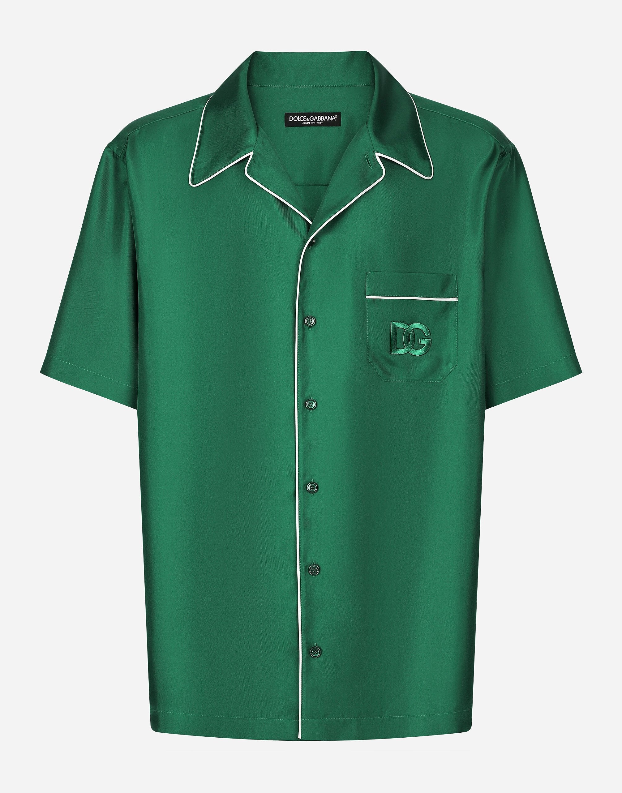 Pictorial, at times volumetric with a textured effect, the decorative “calligraphic-naturalistic” majolica in solid-color green gives life to a collection distinguished by eclectic silhouettes, some stolen from the world of sports, with a cool and light vibe. The vibrant two-tone accenting – green and white – is designed to enhance a series of details, such as the pockets, the green piping paired with the white silk pajamas, the stripes on the polo-shirts, the cuffs on the shirts or the jersey inserts on the T-shirts. Silk twill shirt: • Green • Loose fit • Hawaiian shirt collar • Button fastenings • Short sleeves • Front patch breast pocket with DG logo embroidery • Contrasting-color piping • The piece measures 78 cm from the rear collar seam on a size IT 40 • Made in Italy External composition: 100% Silk