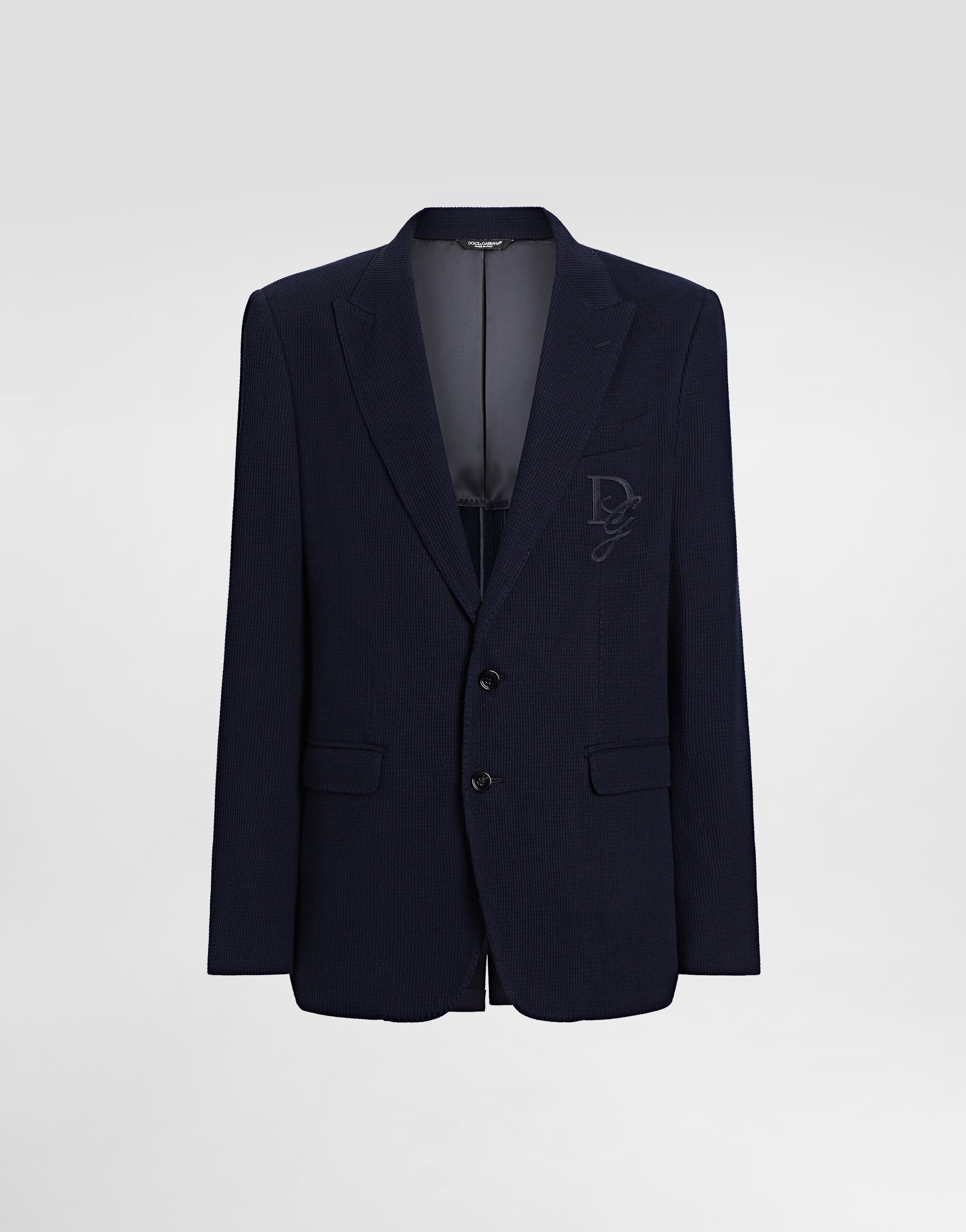 The Italian Holiday Men's Collection revisits 1950s style with a blend of relaxed fits and modern flair. Classic white shirts and tailored suits in refined fabrics contrast with casual denim and playful T-shirts featuring retro graphics with a futuristic twist. Bold prints—chessboards, cats, elegant lighters, and Mediterranean blue ribbons—alongside logo jacquard inspired by ties, infuse a contemporary edge into the essence of Italian holidays. Tailored single-breasted cotton jersey jacket with tonal DG logo embroidery: • Blue • Taormina fit • Notched lapels • Button fastenings on the front • Outer flap pockets and breast pocket, inner welt pockets • Buttoned cuffs • Central vent • Partially lined • The piece measures 73.5 cm from the rear collar seam on a size IT 48 • Made in Italy External composition: 100% Cotton Internal composition: 100% Viscose