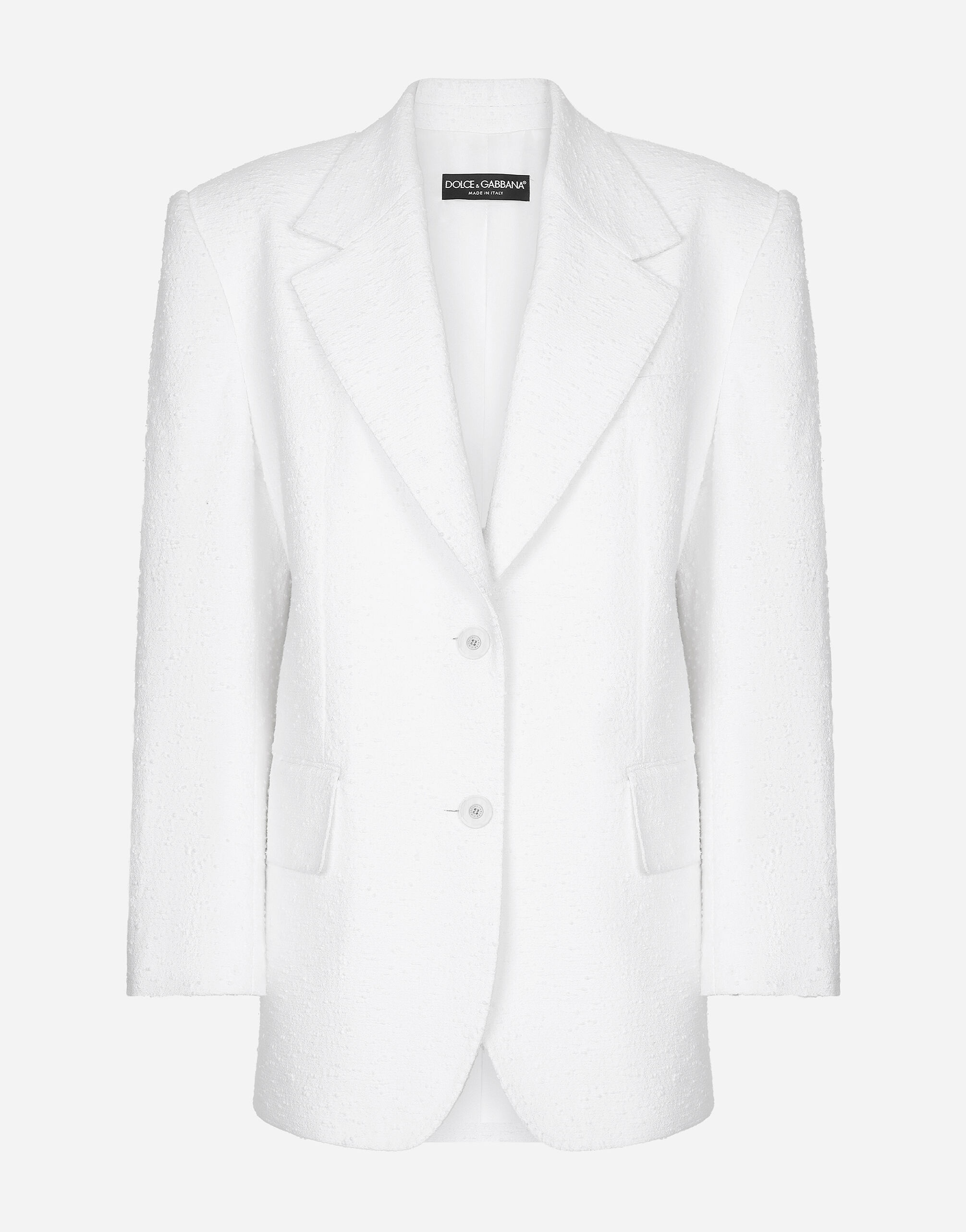 The Italian summers of the 1960s, the candid purity of white, the sophisticated elegance of the jet set of that era. The imagery of the FW24/25 Capri Collection encapsulates all this flawlessly. The pieces range from floaty poplin silhouettes or sack-style dresses and skirts, to brocade outerwear and floral-inlay fabric shirts. The iconic bags – the Logo Bag, the Sicily Bag and the Dolce Box – complement the looks, while the shoes come embroidered with designs inspired by the crystal-clear sea of Capri. Single-breasted cotton raschel tweed jacket: • White • Notched lapel collar • Long sleeves • Silk satin lining • Mother-of-pearl-effect button fastenings • The piece measures 78 cm from the center back on a size IT 40 • The model is 175 cm tall and wears a size IT 40 • Made in Italy External composition: 80% Cotton 15% Linen 05% Polyamide Internal composition: 100% Silk