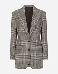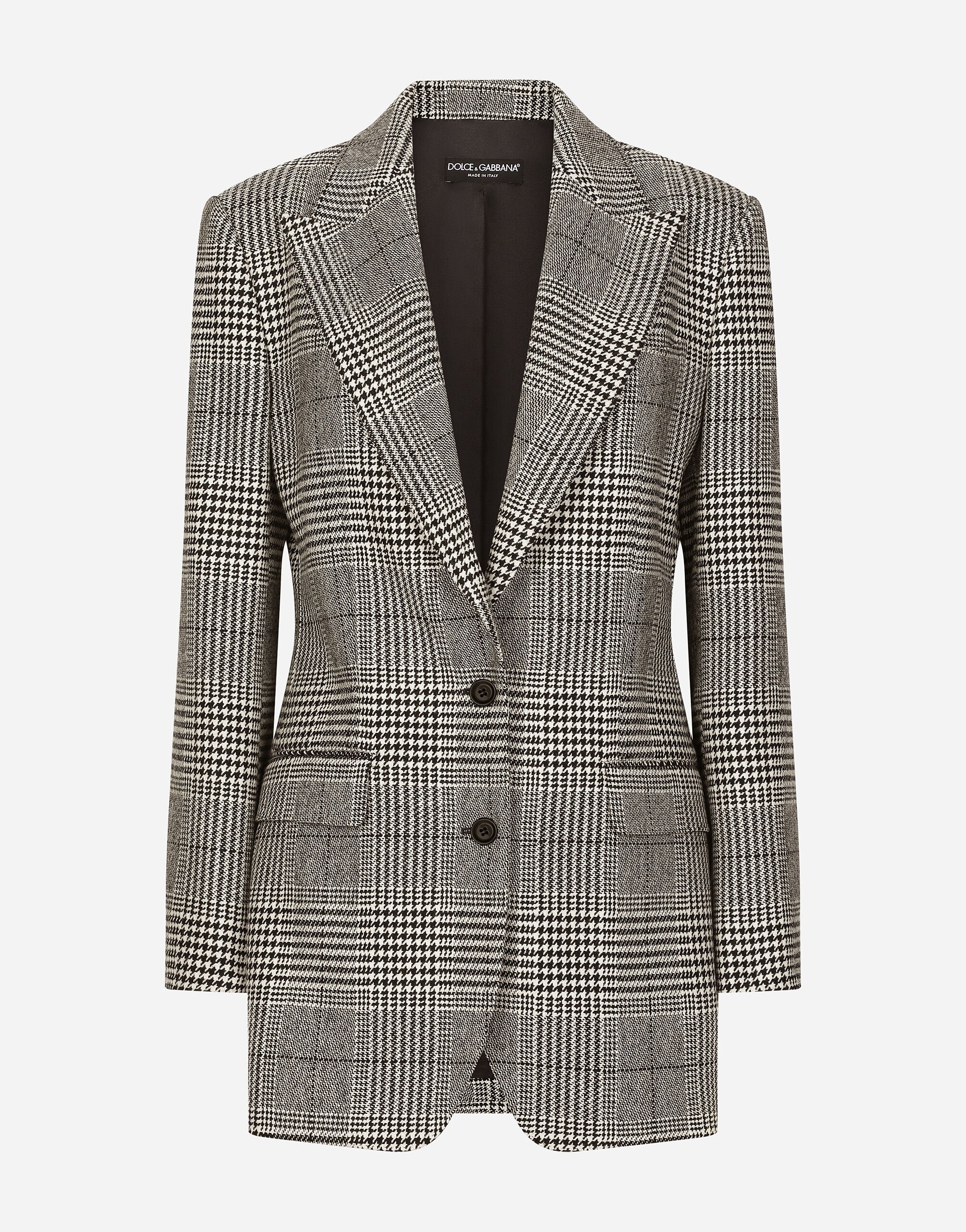 Inspired by 80s fashion photography, the Black Sicily collection masterfully blends masculine and feminine elements, pairing tailored cuts and corset details for the FW 24/25 season. A new vision of the iconic Nero Sicilia black is conveyed through contemporary and sensual looks: jackets and skirts in all-over glen plaid pair with openwork socks, while the 50s-inspired Mun shoes with Eva heel go with the houndstooth Sicily bag featuring crocodile-print leather inserts. Single-breasted wool glen plaid and cashmere jacket: • Gray • Notched lapels • Long sleeves • Flap pockets • Comfortable fit • Silk satin lining • Button fastenings • The piece measures 75 cm from the center back on a size IT 40 • The model is 175 cm tall and wears a size IT 40 • Made in Italy External composition: 90% Wool 10% Cashmere Internal composition: 100% Silk