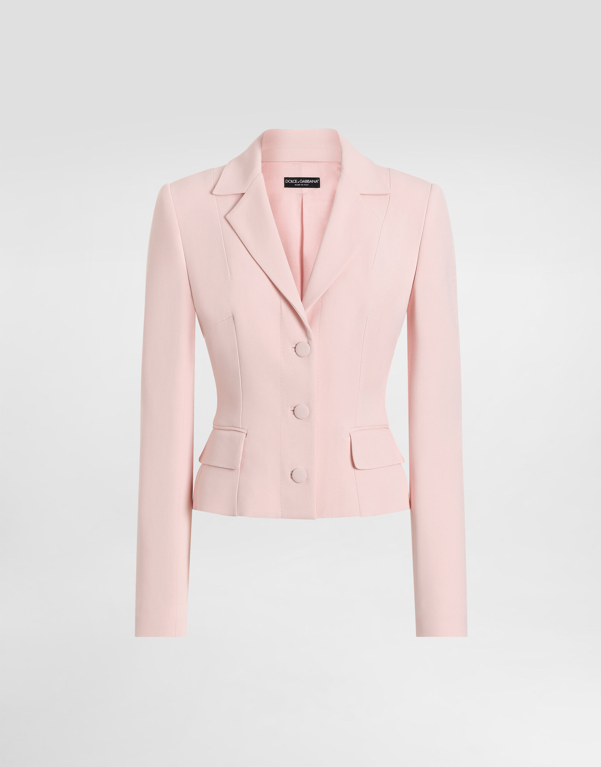This jacket is an essential garment for the modern woman looking for elegance and timeless style. The refined design and attention to detail make it perfect for any occasion. Single-breasted jacket in stretch cady: • Pink • Lapel neckline • Fabric welt eyelets • 3 buttons • Long sleeves • Lined • The model is 175 cm tall and wears size 40 IT • Made in Italy External Composition: 50% Acetate, 47% Viscose, 03% Elastane Internal Composition: 92% Silk, 08% Elastane