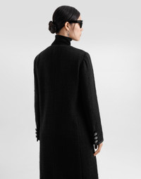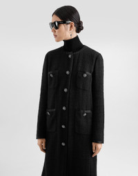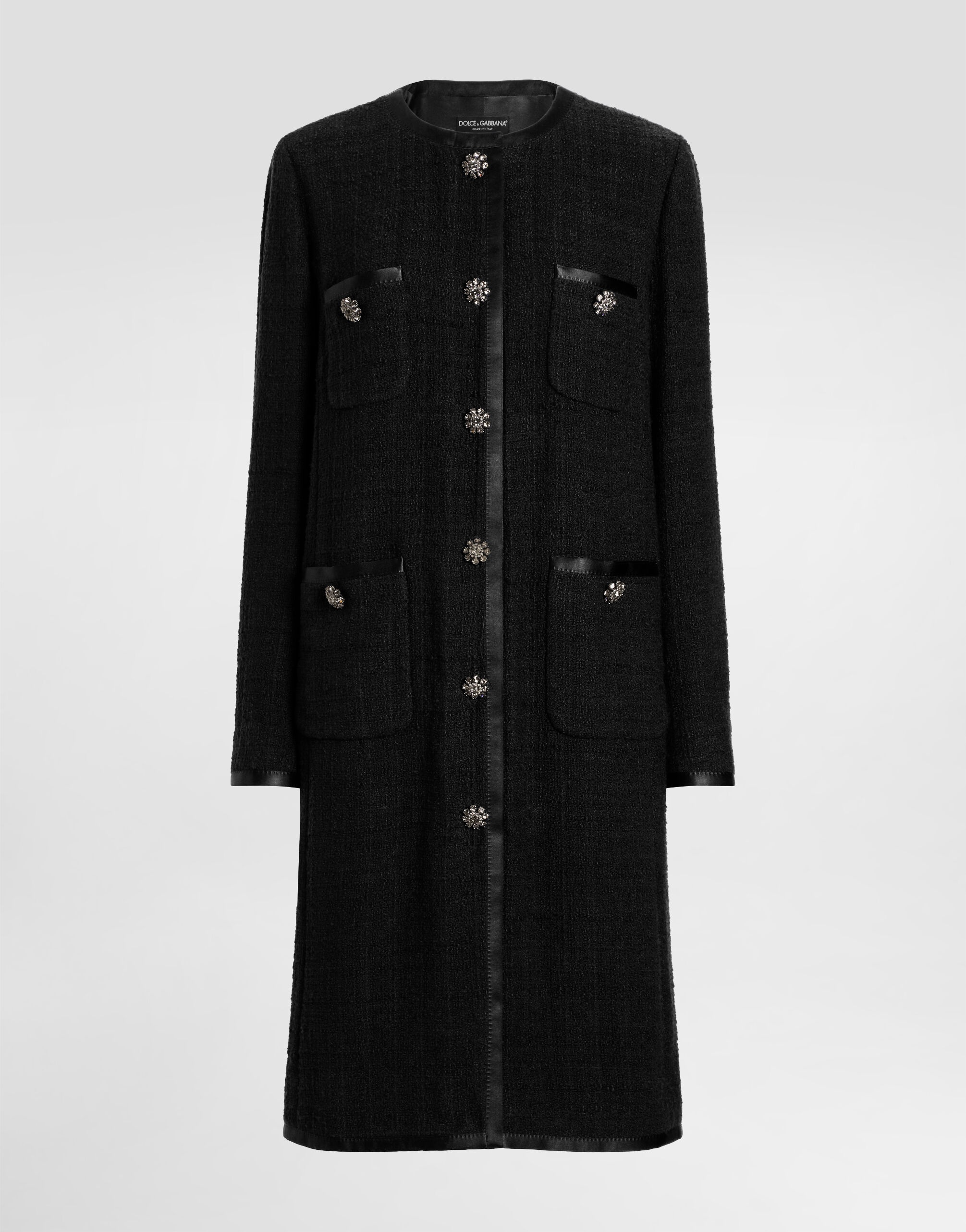 The Women's Black Sicily Collection reinforces Dolce&Gabbana's iconic fabrics and codes rooted in Italian heritage. Sensual silhouettes, highlighted by floral prints and refined corsetry, evoke an intriguing elegance, while the iconic black lace, satin, and velvet dominate the collection. Denim in various shades of blue introduces a contemporary twist, balancing the classic and modern. Embroidered crosses, medals, and jewelry add a sophisticated touch. Single-breasted raschel tweed coat with bejeweled rhinestone buttons: • Black • Round neck • Long sleeves • Pockets • Stretch silk satin lining • Faux rhinestone buttons • Press-stud fastenings • The piece measures 102 cm from the center back on a size IT 40 • The model is 175 cm tall and wears a size IT 40 • Made in Italy External composition: 81% Cotton 9% Viscose 8% Silk 2% Polyester Internal composition: 92% Silk 08% Spandex