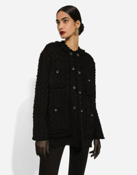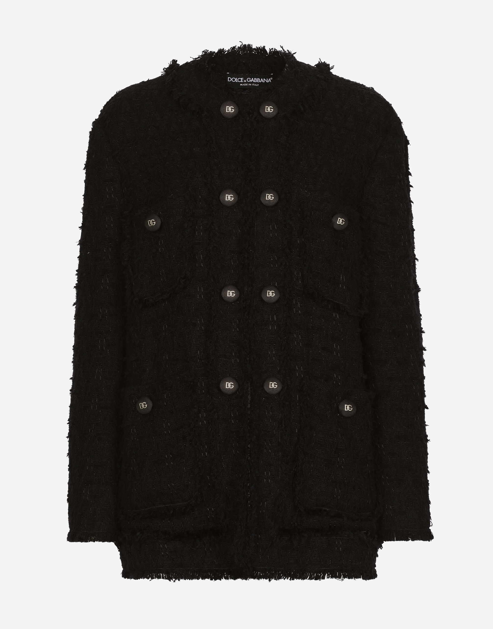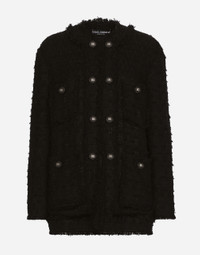 The DNA collection is distinguished by timeless shapes, bringing together three concepts: Sicilian flair, tailoring and sensuality. Nero Sicilia black and optical white predominate and pair with colors that catapult us onto the island of Sicily and make us dream. The designers channel the timeless wardrobe made up of creations that are instantly unmistakable in their simplicity, presenting us with sophisticated beauty loaded with meaning and symbolism that transcends fashion. Single-breasted rush-stitch jacket: • Black • Round neck • Long sleeves • Patch pockets with decorative metal buttons with the DG logo • Leopard-print stretch satin lining • Hook-and-eye fastenings on the front • The piece measures 72 cm from the center back on a size IT 40 • The model is 175 cm tall and wears a size IT 40 • Made in Italy External composition: 67% Cotton 28% Viscose 4% Linen 1% Polyamide Internal composition: 97% Polyester 3% Spandex