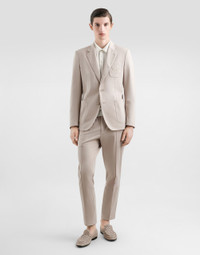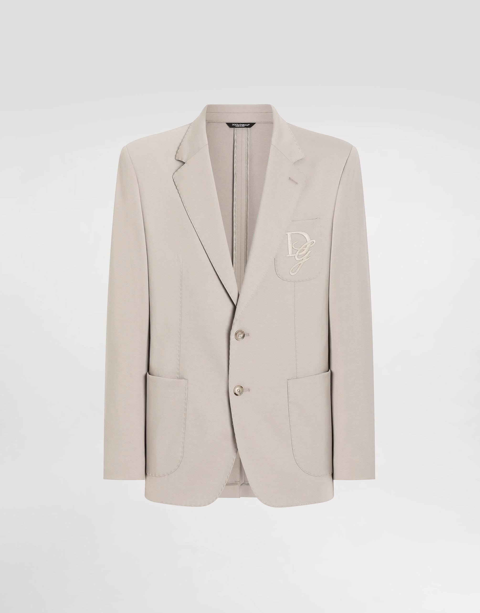 The Italian Holiday Men's Collection revisits 1950s style with a blend of relaxed fits and modern flair. Classic white shirts and tailored suits in refined fabrics contrast with casual denim and playful T-shirts featuring retro graphics with a futuristic twist. Bold prints—chessboards, cats, elegant lighters, and Mediterranean blue ribbons—alongside logo jacquard inspired by ties, infuse a contemporary edge into the essence of Italian holidays. Tailored single-breasted stretch jersey jacket with tonal DG logo embroidery: • Beige • Portofino fit • Notched lapels • Button fastenings on the front • Outer flap pockets and breast pocket, inner welt pockets • Buttoned cuffs • Central vent • Unlined • The piece measures 70 cm from the rear collar seam on a size IT 48 • Made in Italy External composition: 52% Cotton 40% Polyamide 8% Spandex Internal composition: 55% Polyester 45% Viscose