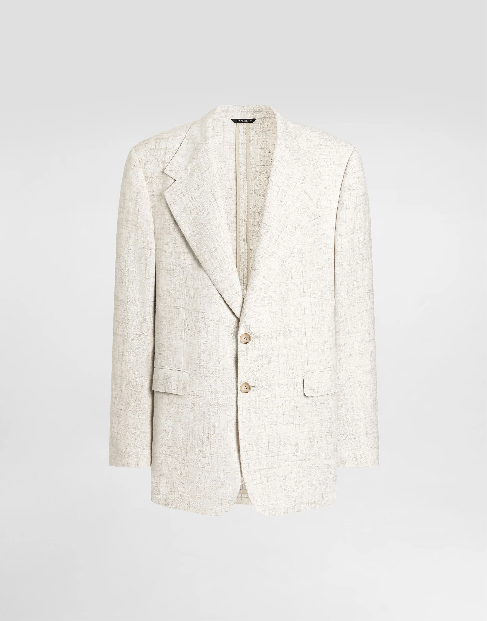 Lightness, Italian aesthetics, and effortless style define the Dolce&Gabbana Men's Spring/Summer 2026 Collection. Pyjamas take center stage, blurring lines between indoor and outdoor spaces with unexpected pairings. Made of striped jacquard cotton, they pair with cardigans, jackets, and sparkling decorations. Relaxed silhouettes, neutral tones with bold contrast details, and iconic accessories complete versatile looks. This single-breasted two-button jacket combines elegance and comfort thanks to its tweed-effect linen viscose fabric, ideal for a sophisticated and versatile look suitable for different occasions. Single-breasted tweed-effect linen and viscose jacket: • Multi-colored • Notch lapels • Semi-canvassed, lined • The model is 185 cm tall and wears a size 48 IT • Made in Italy External composition: 52% Linen, 48% Virgin Wool Internal composition: 76% Acetate, 24% Silk