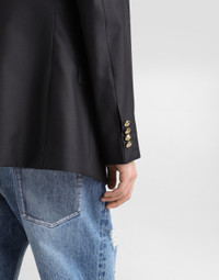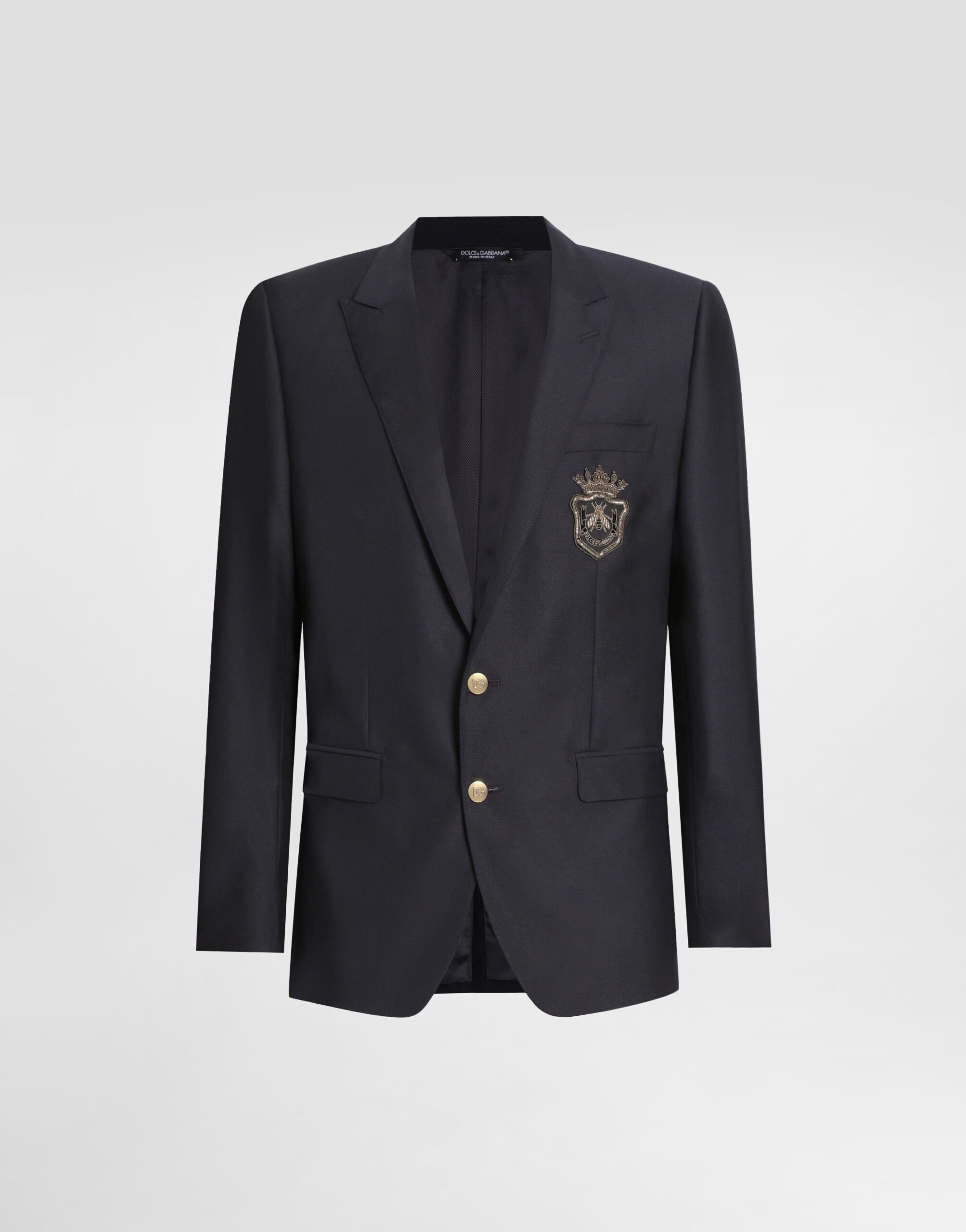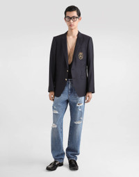 The Italian Holiday Men's Collection revisits 1950s style with a blend of relaxed fits and modern flair. Classic white shirts and tailored suits in refined fabrics contrast with casual denim and playful T-shirts featuring retro graphics with a futuristic twist. Bold prints—chessboards, cats, elegant lighters, and Mediterranean blue ribbons—alongside logo jacquard inspired by ties, infuse a contemporary edge into the essence of Italian holidays. Tailored single-breasted virgin wool and silk jacket with heraldic emblem: • Blue • Martini Fit • Peak lapels • Double-button fastening on the front • Outer flap pockets and breast pocket, and inner welt pockets with button • Buttoned cuffs • Central vent • Lined • The piece measures 73.5 cm from the rear collar seam on a size IT 48 • Made in Italy External composition: 82% Virgin Wool 18% Silk Internal composition: 100% Viscose