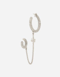 The FW23-24 Collection is sensual, conveying a side of femininity that has nothing to do with being sexy. Sensuality is intrinsically connected to an inner experience that makes women spontaneous and natural, yet charisma is essential. Lace, tulle and chiffon caress the body and redesign shape. Gold and silver create an aura that amplifies sensuality, while white and red celebrate the real meaning of sensuality, representing instinctive passion and deep love. Single rhinestone-detailed Creole earring with chain accent: • Silver • Butterfly backs • Height: 3.5 cm • Nickel-free and hypoallergenic materials • Engraved logo • Made in Italy External composition: 80% Brass 20% Glass