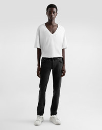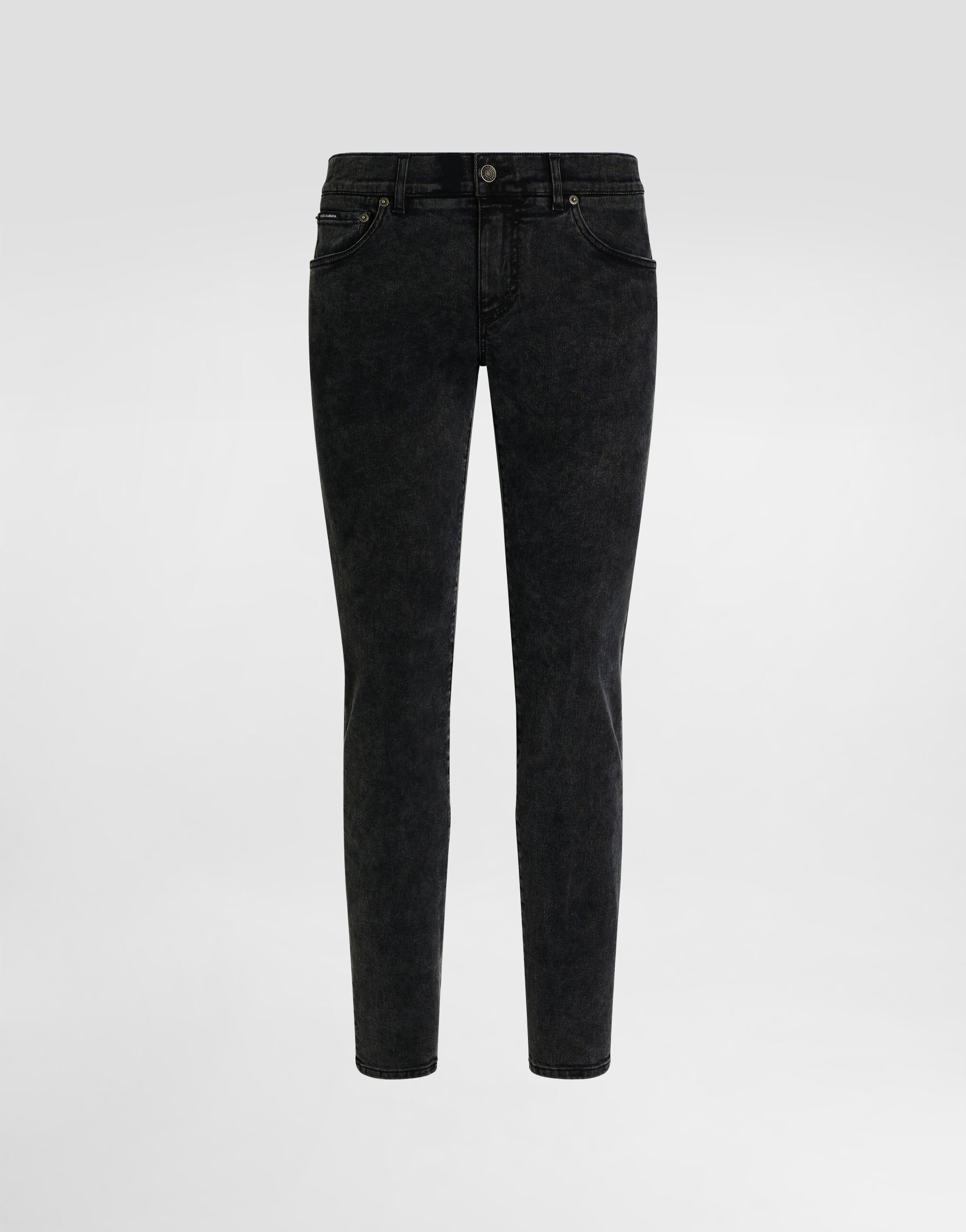 The Italian Holiday Men's Collection revisits 1950s style with a blend of relaxed fits and modern flair. Classic white shirts and tailored suits in refined fabrics contrast with casual denim and playful T-shirts featuring retro graphics with a futuristic twist. Bold prints—chessboards, cats, elegant lighters, and Mediterranean blue ribbons—alongside logo jacquard inspired by ties, infuse a contemporary edge into the essence of Italian holidays. Five-pocket slim-fit jeans in stretch cotton: • Black • Regular fit • Fly-covered zipper and button fastening • Metal Dolce&Gabbana logo tag on the back • The item measures 105 cm on the outer leg and the hem is 16.5 cm wide on a size IT 48 • Made in Italy External composition: 93% Cotton 5% Elastomultiester 2% Spandex