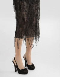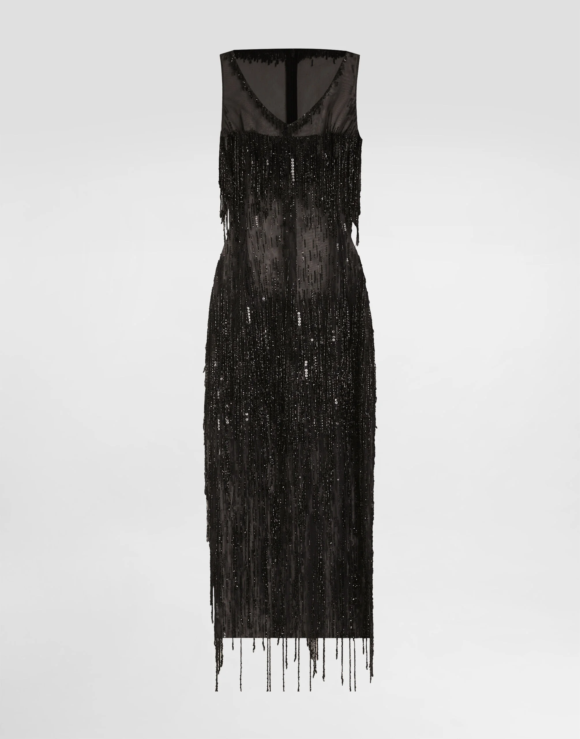 The Spring/Summer 2025 Women’s Collection is celebrating Italian beauty through bold and charismatic femininity. The 50s-inspired lingerie is the star, intermingling with fitted dresses, corsets and oversize trench coats. The iconic jackets have been updated with cropped cuts and modern inserts, while the floral prints add a romantic edge. The eveningwear shines with light fabrics and crystals, accompanied by look-defining accessories, from iconic bags to the cross earrings. Sleeveless calf-length marquisette dress with sequined fringing: • Black • Round neckline • Sleeveless • Unlined • Rear zipper and hook-and-eye fastening • The piece measures 80 cm from the waist down on a size IT 40 • The model is 175 cm tall and wears a size IT 40 • Made in Italy External composition: 100% Polyester