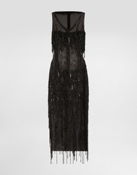 Sleeveless calf-length marquisette dress with sequined fringing