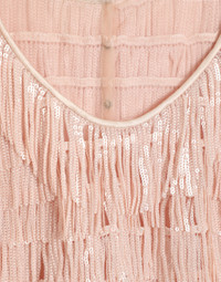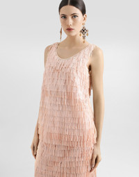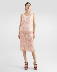 The Spring/Summer 2025 Women’s Collection is celebrating Italian beauty through bold and charismatic femininity. The 50s-inspired lingerie is the star, intermingling with fitted dresses, corsets and oversize trench coats. The iconic jackets have been updated with cropped cuts and modern inserts, while the floral prints add a romantic edge. The eveningwear shines with light fabrics and crystals, accompanied by look-defining accessories, from iconic bags to the cross earrings. Sleeveless top with sequined fringe embellishment: • Pink • Round neckline • Sleeveless • Tulle lining • Hook-and-eye fastenings on the back of the neck • The piece measures 57 cm from the center back on a size IT 40 • The model is 175 cm tall and wears a size IT 40 • Made in Italy External composition: 90% Polyamide 10% Silk Internal composition: 100% Polyamide