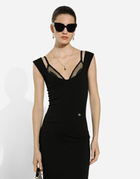 Inspired by 80s fashion photography, the Black Sicily collection masterfully blends masculine and feminine elements, pairing tailored cuts and corset details for the FW 24/25 season. A new vision of the iconic Nero Sicilia black is conveyed through contemporary and sensual looks: jackets and skirts in all-over glen plaid pair with openwork socks, while the 50s-inspired Mun shoes with Eva heel go with the houndstooth Sicily bag featuring crocodile-print leather inserts. Sleeveless viscose knit dress with DG logo: • Black • 14-gauge knit • Sweetheart neckline • Sleeveless • Drop-stitch worked • Dense, compact hand • Tubular hem • Form fitting • Metal DG logo • Rear zipper and hook-and-eye fastening • The piece measures 112 cm from the shoulder seam on a size IT 40 • The model is 175 cm tall and wears a size IT 40 • Made in Italy External composition: 71% Viscose 15% Polyester 8% Polyamide 6% Spandex