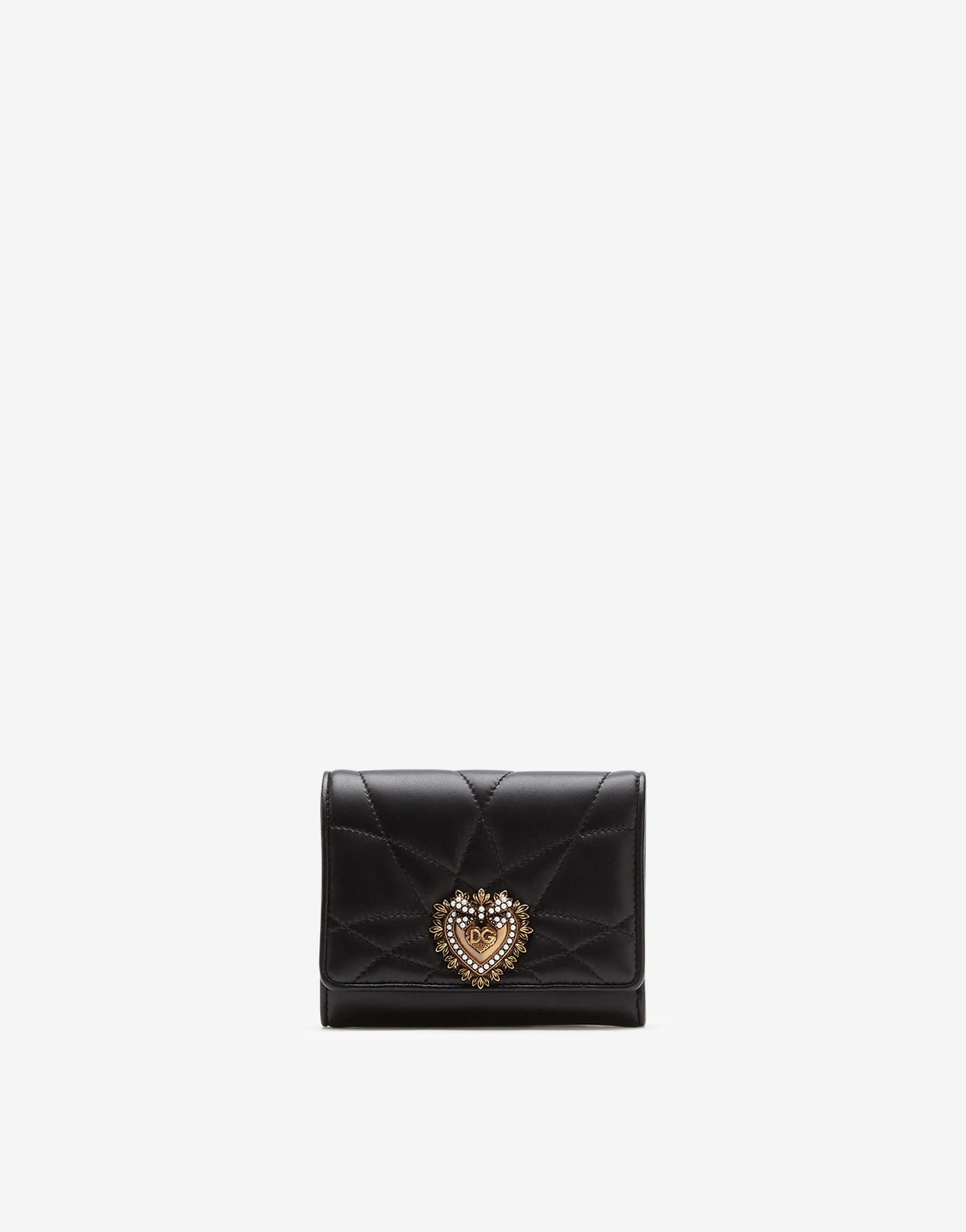 Continental Devotion wallet in soft quilted nappa leather. Its small dimensions mean it is perfect for smaller bags too. It features exclusive finishes with the iconic bejeweled branded heart hand-tooled from a metal alloy with pearl inlay: • Front flap with hidden press-stud fastening with Devotion heart • Four card slots • One bill compartment • Central coin pocket with flap and press-stud fastening • Measurements: 12 x 9 x 2 cm - 4.7 x 3.5 x 0.8 inches • Made in Italy Care And Details External composition: 100% Lambskin Internal composition: 90% Calfskin 10% Rayon
