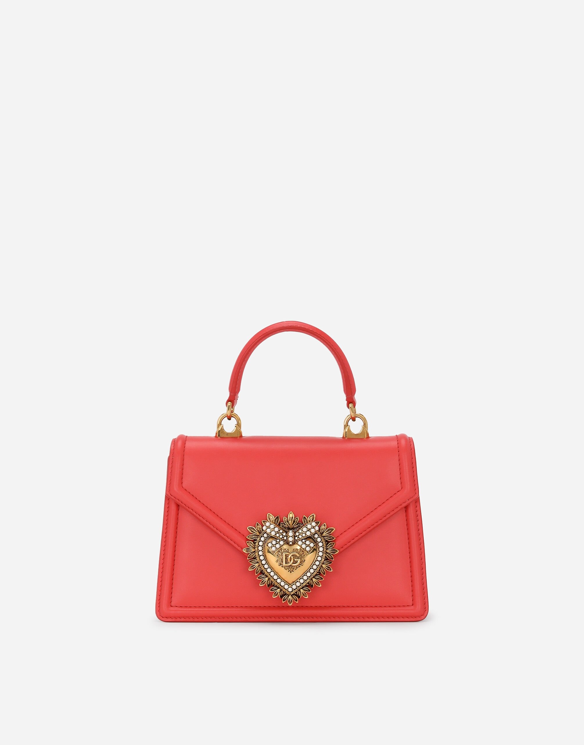 This small top-handle Devotion bag comes in calfskin. Feminine and versatile, it is distinguished by the exclusive bejeweled heart fastening and the shoulder strap inspired by the techniques of high-quality jewelers. Small calfskin Devotion top-handle bag: • Red • Front flap with bejeweled branded heart made from hand-tooled metal alloy with pearl inlay • Concealed magnetic fastening and customized heart • Top handle and detachable shoulder strap • Calfskin lining with flat pocket • Item comes in themed packaging • Measurements: H13 x W19 x D4.5 cm • Made in Italy External composition: 100% Calfskin Internal composition: 100% Calfskin