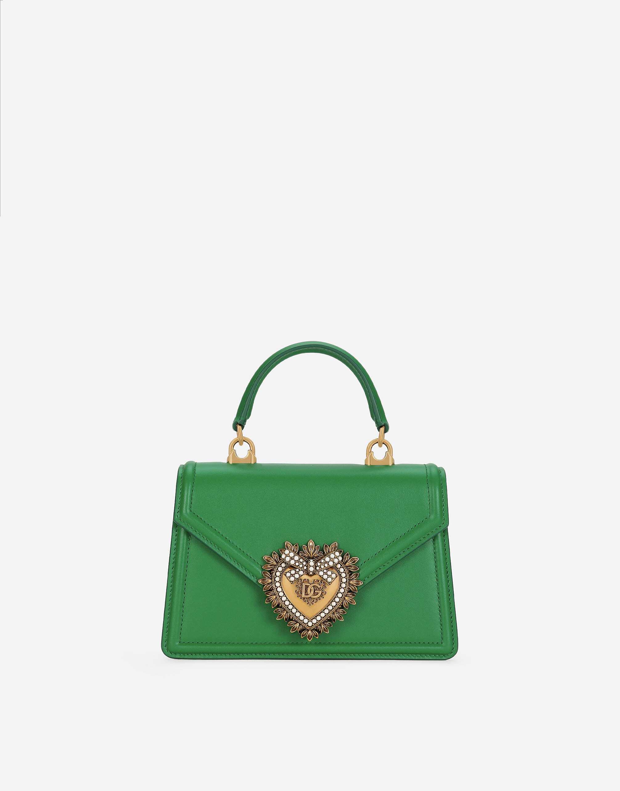 This small top-handle Devotion bag comes in calfskin. Feminine and versatile, it is distinguished by the exclusive bejeweled heart fastening and the shoulder strap inspired by the techniques of high-quality jewelers. Small calfskin Devotion top-handle bag: • Green • Front flap with bejeweled branded heart made from hand-tooled metal alloy with pearl inlay • Concealed magnetic fastening and customized heart • Top handle and detachable chain strap • Calfskin interior with flat pocket • Item comes in themed packaging • Measurements: H13 x W19 x D4.5 cm • Made in Italy External composition: 100% Calfskin Internal composition: 100% Calfskin