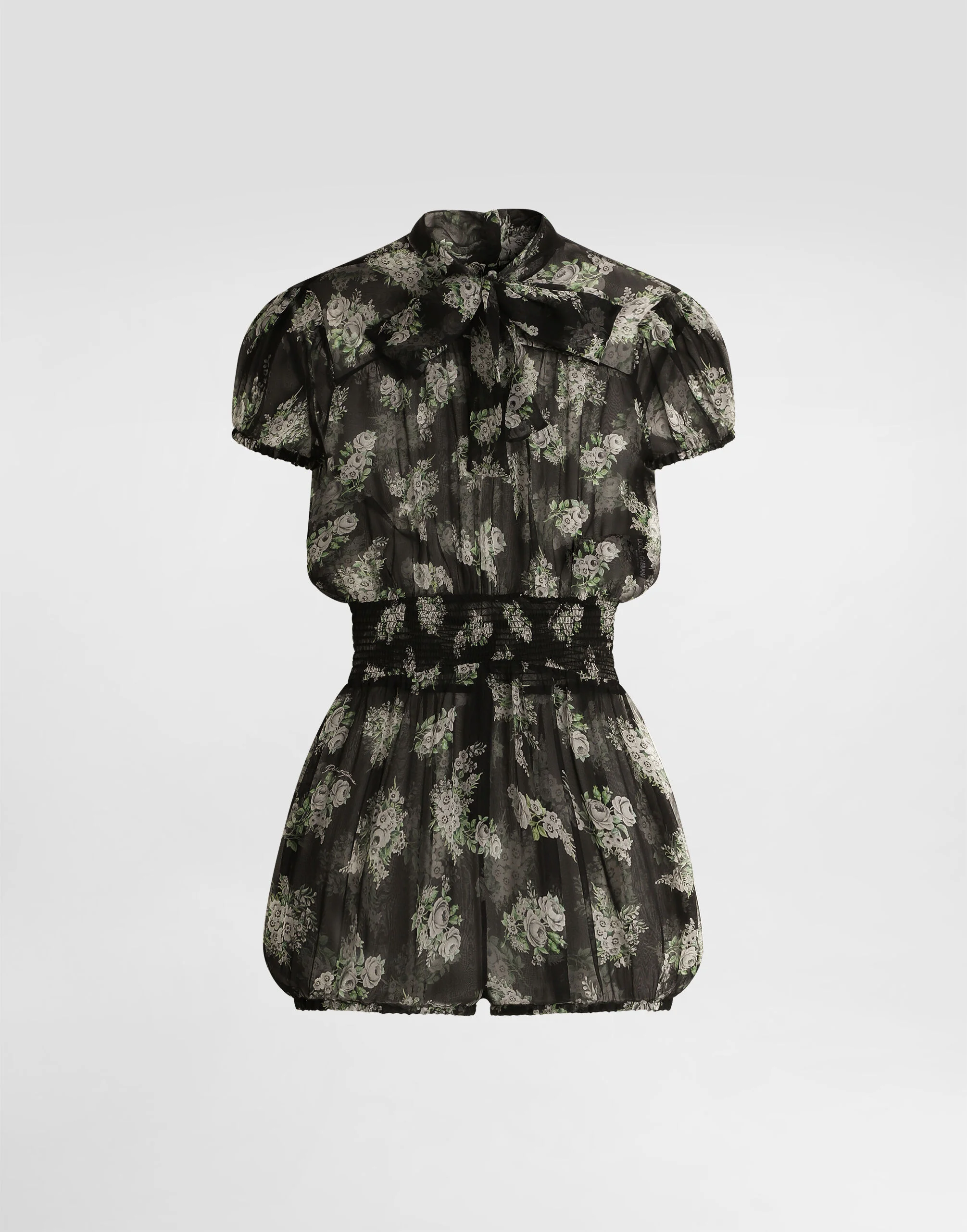 The SS26 Women's Fashion Show Collection is the result of a play of harmonious contrasts: masculine and feminine, day and evening, tailored and casual. Pyjamas take centre stage, paired with lingerie and formal garments. The play of layers and the mix of different influences contribute to expressing the relaxed attitude and unique, original style at the heart of the collection. This chiffon jumpsuit with Flower bouquet print represents the elegance and refinement of Dolce&Gabbana design. Perfect for events and special evenings, it offers a sophisticated and feminine look. Small flower bouquet-print chiffon jumpsuit: • Multi-colored • Simple front yoke • Crew neck with scarf • Closure with two buttons and loops • Invisible zip closure at the center back • Smocked waistband • Short sleeves with light gathering • Culotte with a double-layer gusset • The model is 175 cm tall and wears size 40 IT • Made in Italy The difference in the print placement that you may find on this product is a feature of Dolce&Gabbana’s “Handmade” pieces. A detail that makes every garment or accessory unique and exclusive. External Composition: 100% Silk