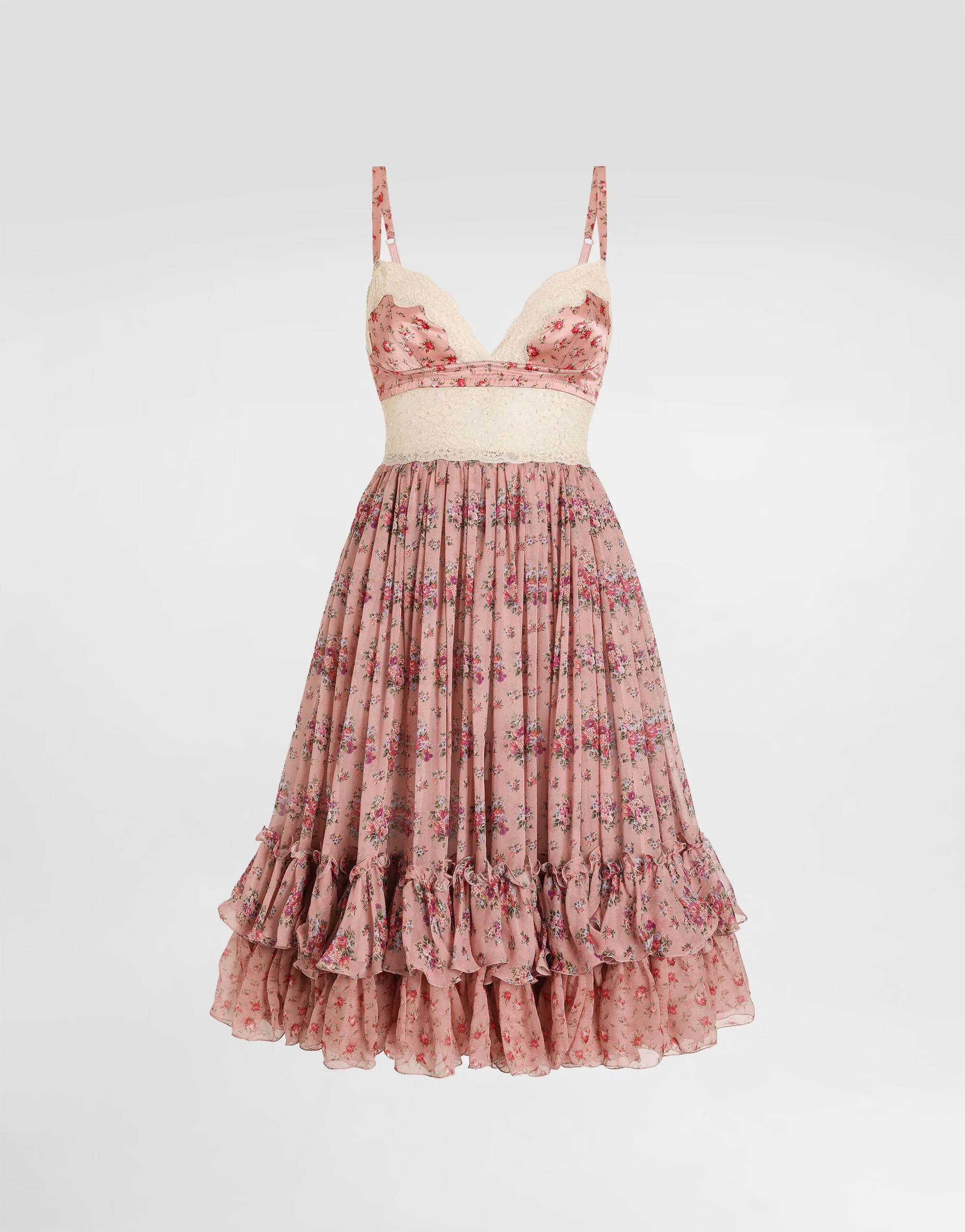 This small flower bouquets-print chiffon dress is an example of elegance and sophistication, perfect for special occasions. The sophisticated design and lace details make it a distinctive piece in any woman's wardrobe. Small flower bouquets-print chiffon dress: • Multi-colored • Satin bra bodice without underwire • Encrusted lace • Gathered chiffon skirt with flounces at the hem • Invisible zip at the center back • Length from waist 60 cm on size 40 IT • Center back length 63 cm on size 40 IT • The model is 175 cm tall and wears size 40 IT • Made in Italy The difference in the print placement that you may find on this product is a feature of Dolce&Gabbana’s “Handmade” pieces. A detail that makes every garment or accessory unique and exclusive. External Composition: 80% Silk, 18% Cotton, 2% Polyamide